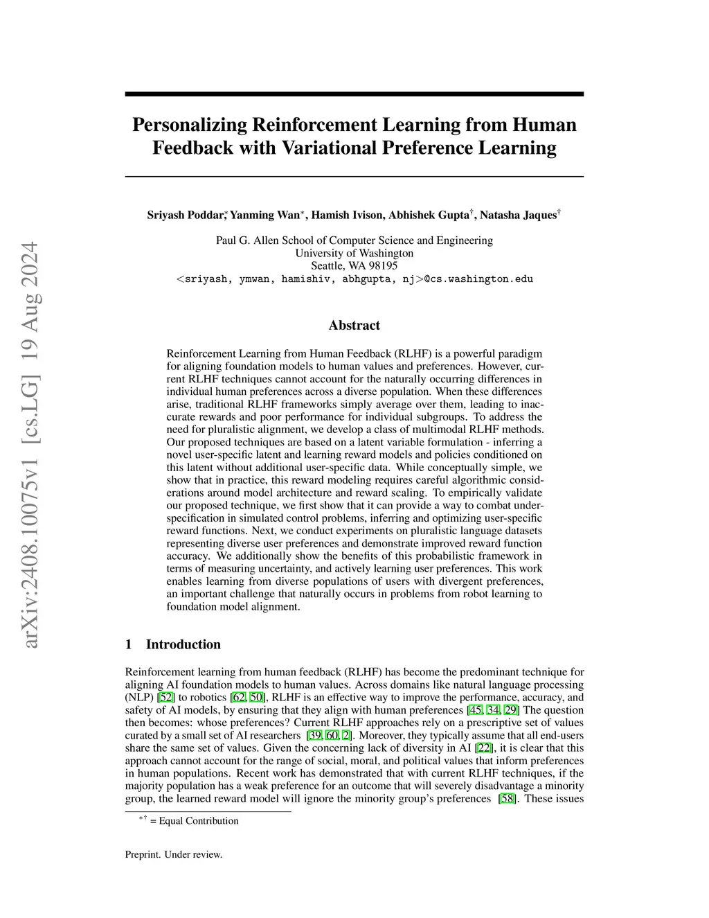 Reinforcement Learning from Human Feedback (RLHF) is a powerful paradigm for aligning foundation models to human values and preferences. However, current RLHF techniques cannot account for the naturally occurring differences in individual human preferences across a diverse population. When these differences arise, traditional RLHF frameworks simply average over them, leading to inaccurate rewards and poor performance for individual subgroups. To address the need for pluralistic alignment, we develop a class of multimodal RLHF methods. Our proposed techniques are based on a latent variable formulation - inferring a novel user-specific latent and learning reward models and policies conditioned on this latent without additional user-specific data. While conceptually simple, we show that in practice, this reward modeling requires careful algorithmic considerations around model architecture and reward scaling. To empirically validate our proposed technique, we first show that it can provide a way to combat underspecification in simulated control problems, inferring and optimizing user-specific reward functions. Next, we conduct experiments on pluralistic language datasets representing diverse user preferences and demonstrate improved reward function accuracy. We additionally show the benefits of this probabilistic framework in terms of measuring uncertainty, and actively learning user preferences. This work enables learning from diverse populations of users with divergent preferences, an important challenge that naturally occurs in problems from robot learning to foundation model alignment.