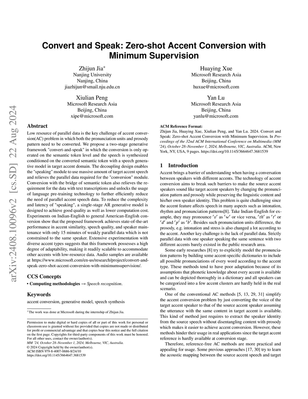 Low resource of parallel data is the key challenge of accent conversion(AC) problem in which both the pronunciation units and prosody pattern need to be converted. We propose a two-stage generative framework "convert-and-speak" in which the conversion is only operated on the semantic token level and the speech is synthesized conditioned on the converted semantic token with a speech generative model in target accent domain. The decoupling design enables the "speaking" module to use massive amount of target accent speech and relieves the parallel data required for the "conversion" module. Conversion with the bridge of semantic token also relieves the requirement for the data with text transcriptions and unlocks the usage of language pre-training technology to further efficiently reduce the need of parallel accent speech data. To reduce the complexity and latency of "speaking", a single-stage AR generative model is designed to achieve good quality as well as lower computation cost. Experiments on Indian-English to general American-English conversion show that the proposed framework achieves state-of-the-art performance in accent similarity, speech quality, and speaker maintenance with only 15 minutes of weakly parallel data which is not constrained to the same speaker. Extensive experimentation with diverse accent types suggests that this framework possesses a high degree of adaptability, making it readily scalable to accommodate other accents with low-resource data. Audio samples are available at https://www.microsoft.com/en-us/research/project/convert-and-speak-zero-shot-accent-conversion-with-minimumsupervision/.