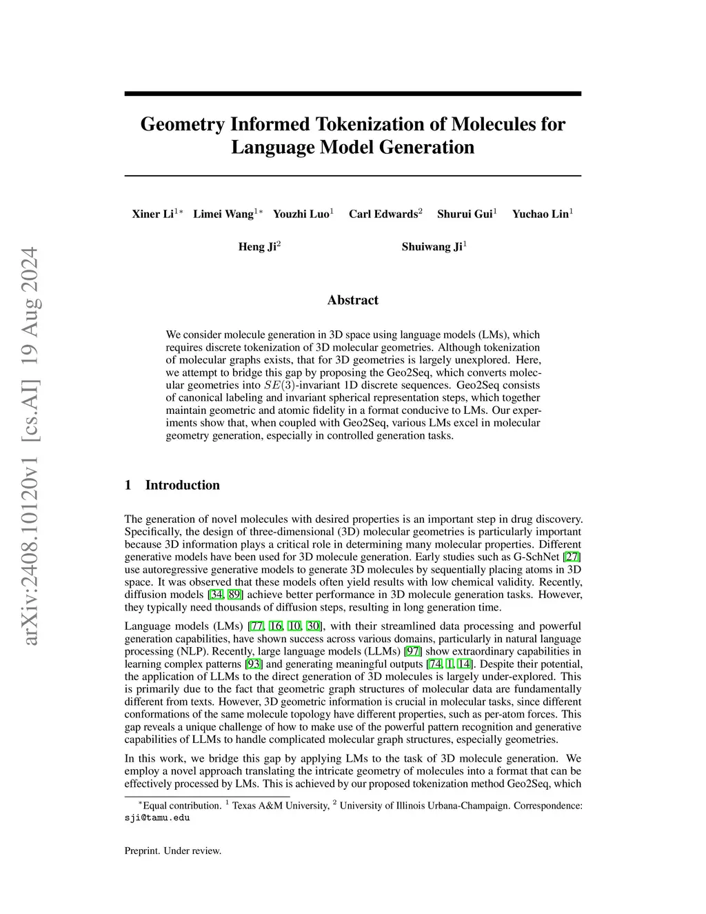 Geometry Informed Tokenization of Molecules for Language Model