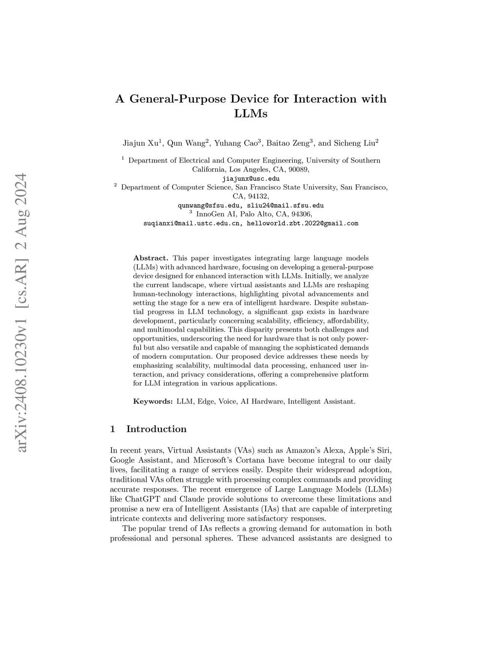This paper investigates integrating large language models (LLMs) with advanced hardware, focusing on developing a general-purpose device designed for enhanced interaction with LLMs. Initially, we analyze the current landscape, where virtual assistants and LLMs are reshaping human-technology interactions, highlighting pivotal advancements and setting the stage for a new era of intelligent hardware. Despite substantial progress in LLM technology, a significant gap exists in hardware development, particularly concerning scalability, efficiency, affordability, and multimodal capabilities. This disparity presents both challenges and opportunities, underscoring the need for hardware that is not only powerful but also versatile and capable of managing the sophisticated demands of modern computation. Our proposed device addresses these needs by emphasizing scalability, multimodal data processing, enhanced user interaction, and privacy considerations, offering a comprehensive platform for LLM integration in various applications.