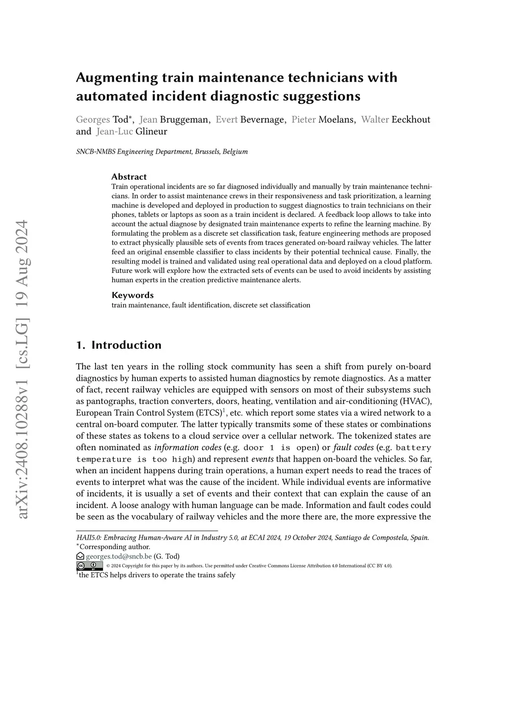 Train operational incidents are so far diagnosed individually and manually by train maintenance technicians. In order to assist maintenance crews in their responsiveness and task prioritization, a learning machine is developed and deployed in production to suggest diagnostics to train technicians on their phones, tablets or laptops as soon as a train incident is declared. A feedback loop allows to take into account the actual diagnose by designated train maintenance experts to refine the learning machine. By formulating the problem as a discrete set classification task, feature engineering methods are proposed to extract physically plausible sets of events from traces generated on-board railway vehicles. The latter feed an original ensemble classifier to class incidents by their potential technical cause. Finally, the resulting model is trained and validated using real operational data and deployed on a cloud platform. Future work will explore how the extracted sets of events can be used to avoid incidents by assisting human experts in the creation predictive maintenance alerts.