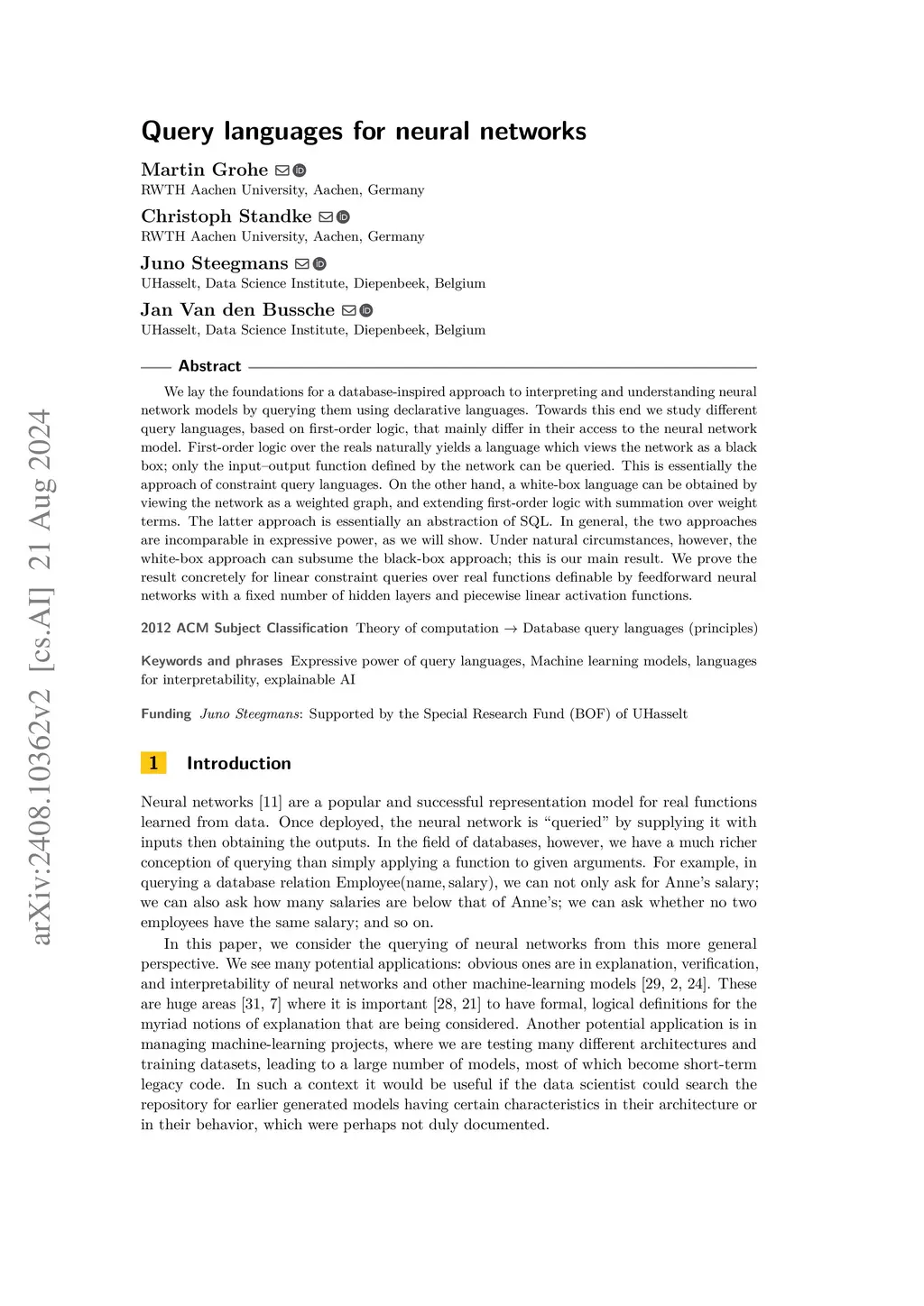 We lay the foundations for a database-inspired approach to interpreting and understanding neural network models by querying them using declarative languages. Towards this end we study different query languages, based on first-order logic, that mainly differ in their access to the neural network model. First-order logic over the reals naturally yields a language which views the network as a black box; only the input--output function defined by the network can be queried. This is essentially the approach of constraint query languages. On the other hand, a white-box language can be obtained by viewing the network as a weighted graph, and extending first-order logic with summation over weight terms. The latter approach is essentially an abstraction of SQL. In general, the two approaches are incomparable in expressive power, as we will show. Under natural circumstances, however, the white-box approach can subsume the black-box approach; this is our main result. We prove the result concretely for linear constraint queries over real functions definable by feedforward neural networks with a fixed number of hidden layers and piecewise linear activation functions.