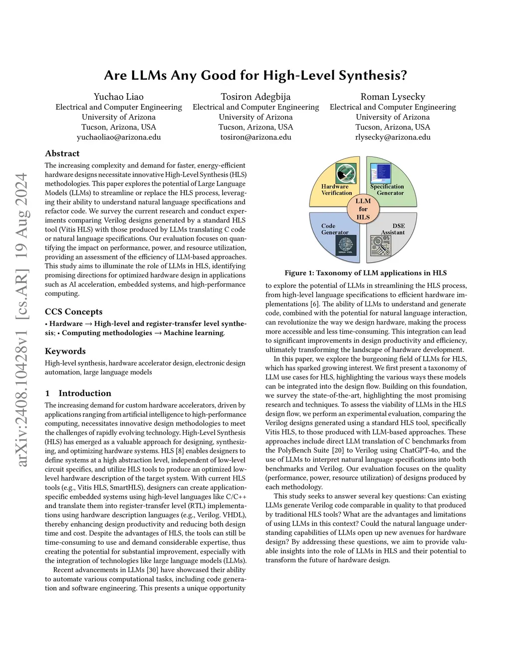 The increasing complexity and demand for faster, energy-efficient hardware designs necessitate innovative High-Level Synthesis (HLS) methodologies. This paper explores the potential of Large Language Models (LLMs) to streamline or replace the HLS process, leveraging their ability to understand natural language specifications and refactor code. We survey the current research and conduct experiments comparing Verilog designs generated by a standard HLS tool (Vitis HLS) with those produced by LLMs translating C code or natural language specifications. Our evaluation focuses on quantifying the impact on performance, power, and resource utilization, providing an assessment of the efficiency of LLM-based approaches. This study aims to illuminate the role of LLMs in HLS, identifying promising directions for optimized hardware design in applications such as AI acceleration, embedded systems, and high-performance computing.