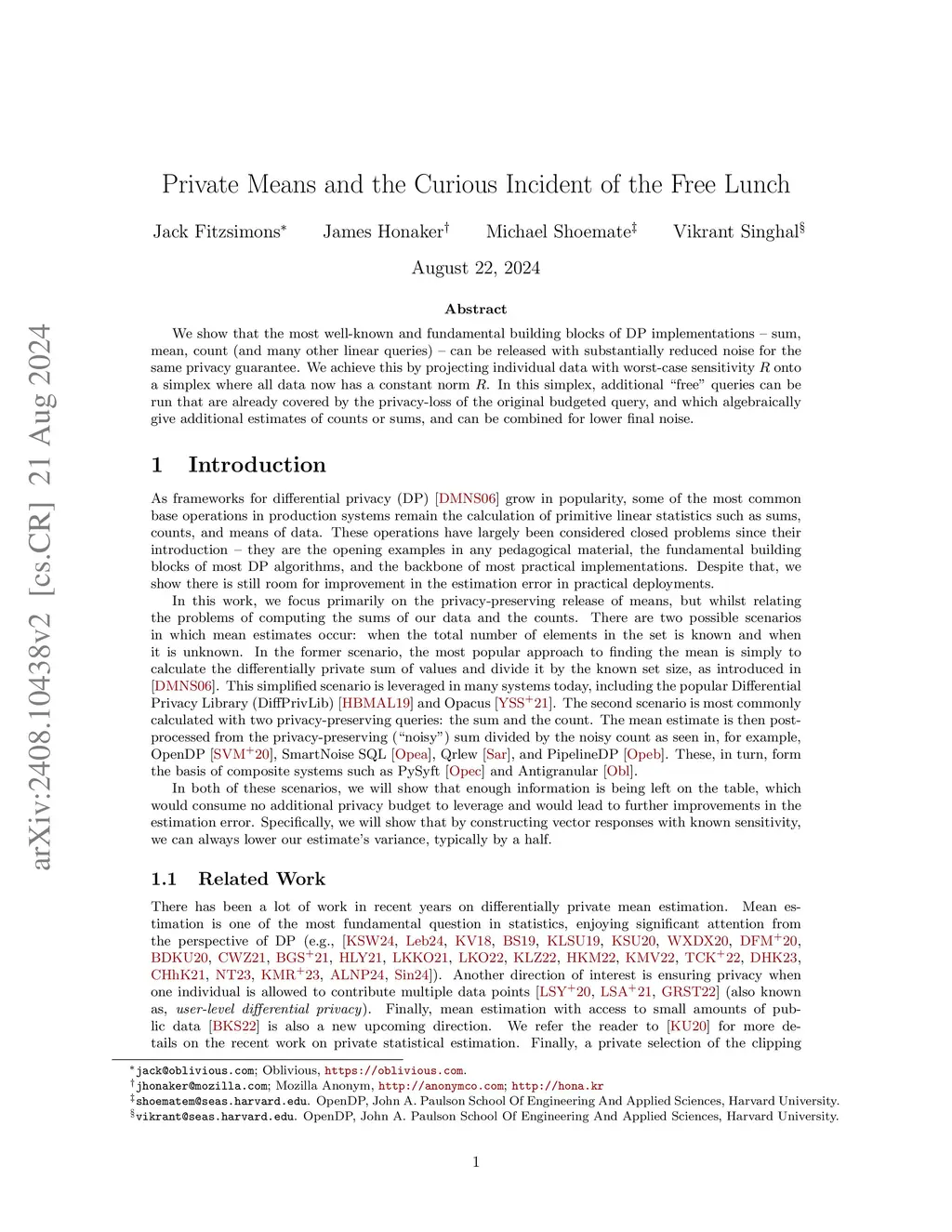 We show that the most well-known and fundamental building blocks of DP implementations -- sum, mean, count (and many other linear queries) -- can be released with substantially reduced noise for the same privacy guarantee. We achieve this by projecting individual data with worst-case sensitivity onto a simplex where all data now has a constant norm . In this simplex, additional ``free'' queries can be run that are already covered by the privacy-loss of the original budgeted query, and which algebraically give additional estimates of counts or sums.