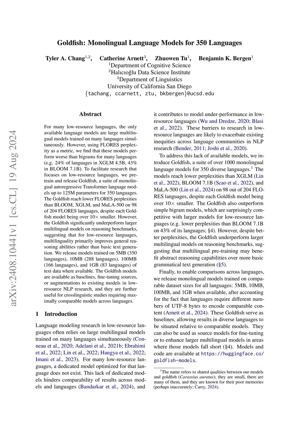 For many low-resource languages, the only available language models are large multilingual models trained on many languages simultaneously. However, using FLORES perplexity as a metric, we find that these models perform worse than bigrams for many languages (e.g. 24% of languages in XGLM 4.5B; 43% in BLOOM 7.1B). To facilitate research that focuses on low-resource languages, we pre-train and release Goldfish, a suite of monolingual autoregressive Transformer language models up to 125M parameters for 350 languages. The Goldfish reach lower FLORES perplexities than BLOOM, XGLM, and MaLA-500 on 98 of 204 FLORES languages, despite each Goldfish model being over 10x smaller. However, the Goldfish significantly underperform larger multilingual models on reasoning benchmarks, suggesting that for low-resource languages, multilinguality primarily improves general reasoning abilities rather than basic text generation. We release models trained on 5MB (350 languages), 10MB (288 languages), 100MB (166 languages), and 1GB (83 languages) of text data where available. The Goldfish models are available as baselines, fine-tuning sources, or augmentations to existing models in low-resource NLP research, and they are further useful for crosslinguistic studies requiring maximally comparable models across languages.
