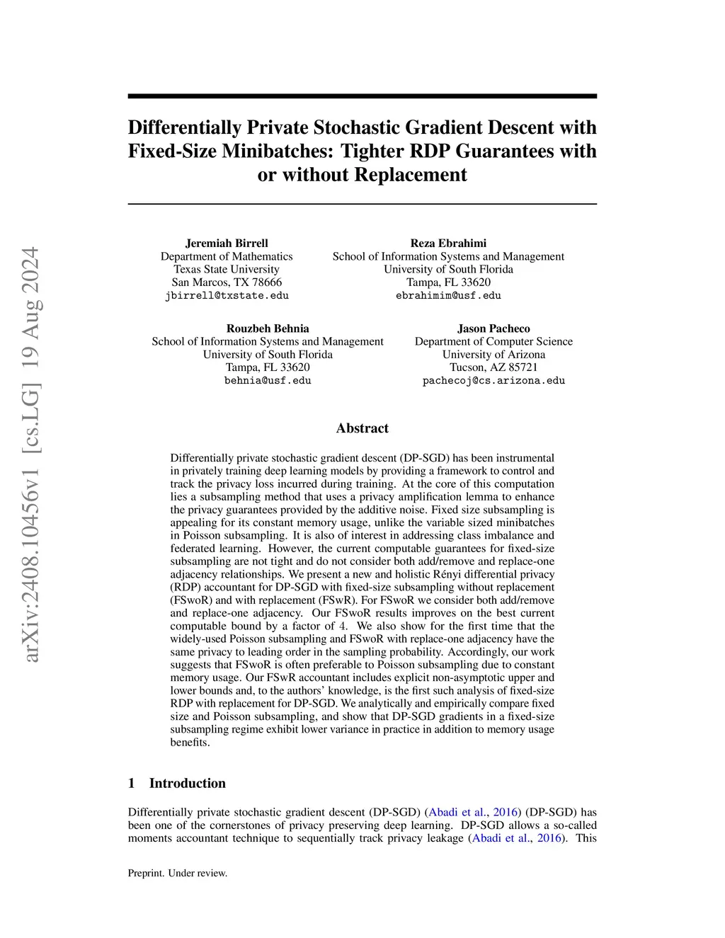 Differentially private stochastic gradient descent (DP-SGD) has been instrumental in privately training deep learning models by providing a framework to control and track the privacy loss incurred during training. At the core of this computation lies a subsampling method that uses a privacy amplification lemma to enhance the privacy guarantees provided by the additive noise. Fixed size subsampling is appealing for its constant memory usage, unlike the variable sized minibatches in Poisson subsampling. It is also of interest in addressing class imbalance and federated learning. However, the current computable guarantees for fixed-size subsampling are not tight and do not consider both add/remove and replace-one adjacency relationships. We present a new and holistic R{\é}nyi differential privacy (RDP) accountant for DP-SGD with fixed-size subsampling without replacement (FSwoR) and with replacement (FSwR). For FSwoR we consider both add/remove and replace-one adjacency. Our FSwoR results improves on the best current computable bound by a factor of . We also show for the first time that the widely-used Poisson subsampling and FSwoR with replace-one adjacency have the same privacy to leading order in the sampling probability. Accordingly, our work suggests that FSwoR is often preferable to Poisson subsampling due to constant memory usage. Our FSwR accountant includes explicit non-asymptotic upper and lower bounds and, to the authors' knowledge, is the first such analysis of fixed-size RDP with replacement for DP-SGD. We analytically and empirically compare fixed size and Poisson subsampling, and show that DP-SGD gradients in a fixed-size subsampling regime exhibit lower variance in practice in addition to memory usage benefits.