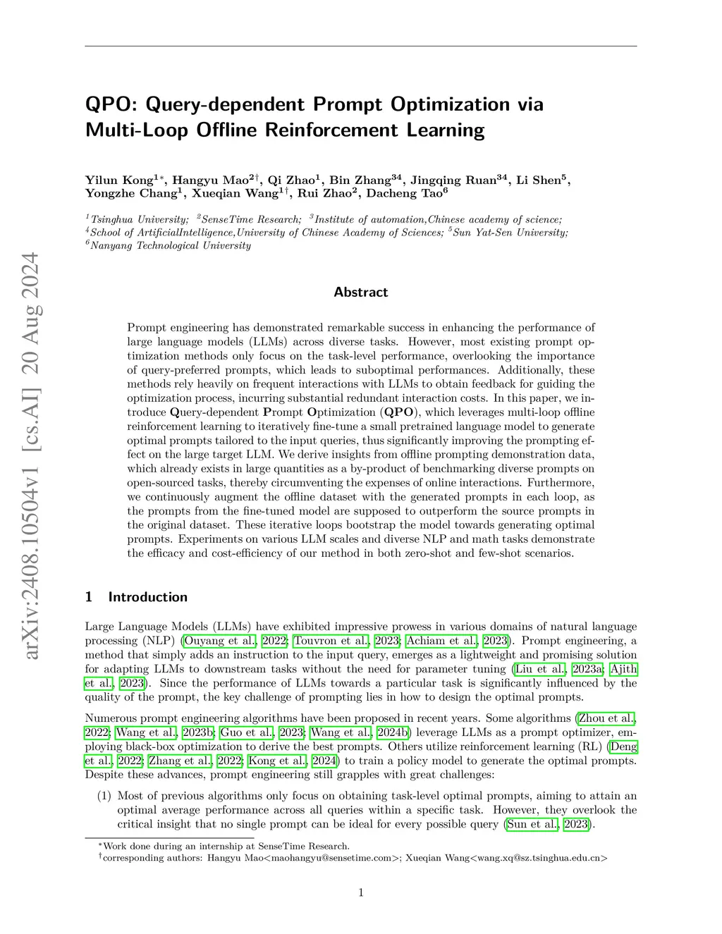 QPO: Query-dependent Prompt Optimization via Multi-Loop Offline Reinforcement Learning