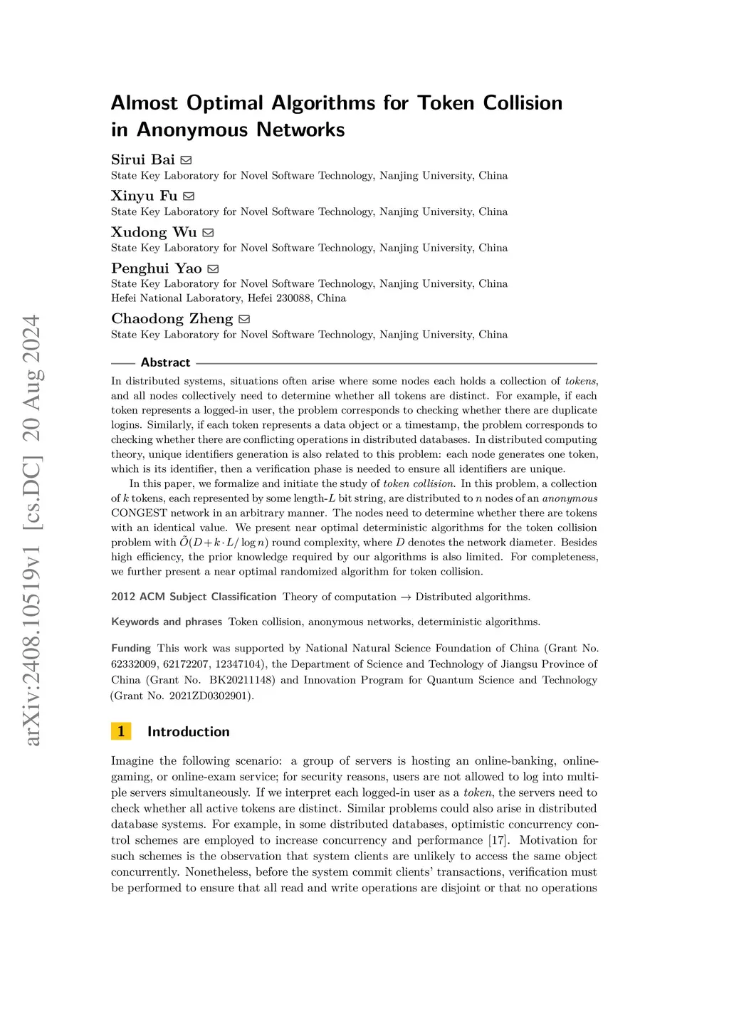 In distributed systems, situations often arise where some nodes each holds a collection of tokens, and all nodes collectively need to determine whether all tokens are distinct. For example, if each token represents a logged-in user, the problem corresponds to checking whether there are duplicate logins. Similarly, if each token represents a data object or a timestamp, the problem corresponds to checking whether there are conflicting operations in distributed databases. In distributed computing theory, unique identifiers generation is also related to this problem: each node generates one token, which is its identifier, then a verification phase is needed to ensure all identifiers are unique. In this paper, we formalize and initiate the study of token collision. In this problem, a collection of tokens, each represented by some length- bit string, are distributed to nodes of an anonymous CONGEST network in an arbitrary manner. The nodes need to determine whether there are tokens with an identical value. We present near optimal deterministic algorithms for the token collision problem with round complexity, where denotes the network diameter. Besides high efficiency, the prior knowledge required by our algorithms is also limited. For completeness, we further present a near optimal randomized algorithm for token collision.