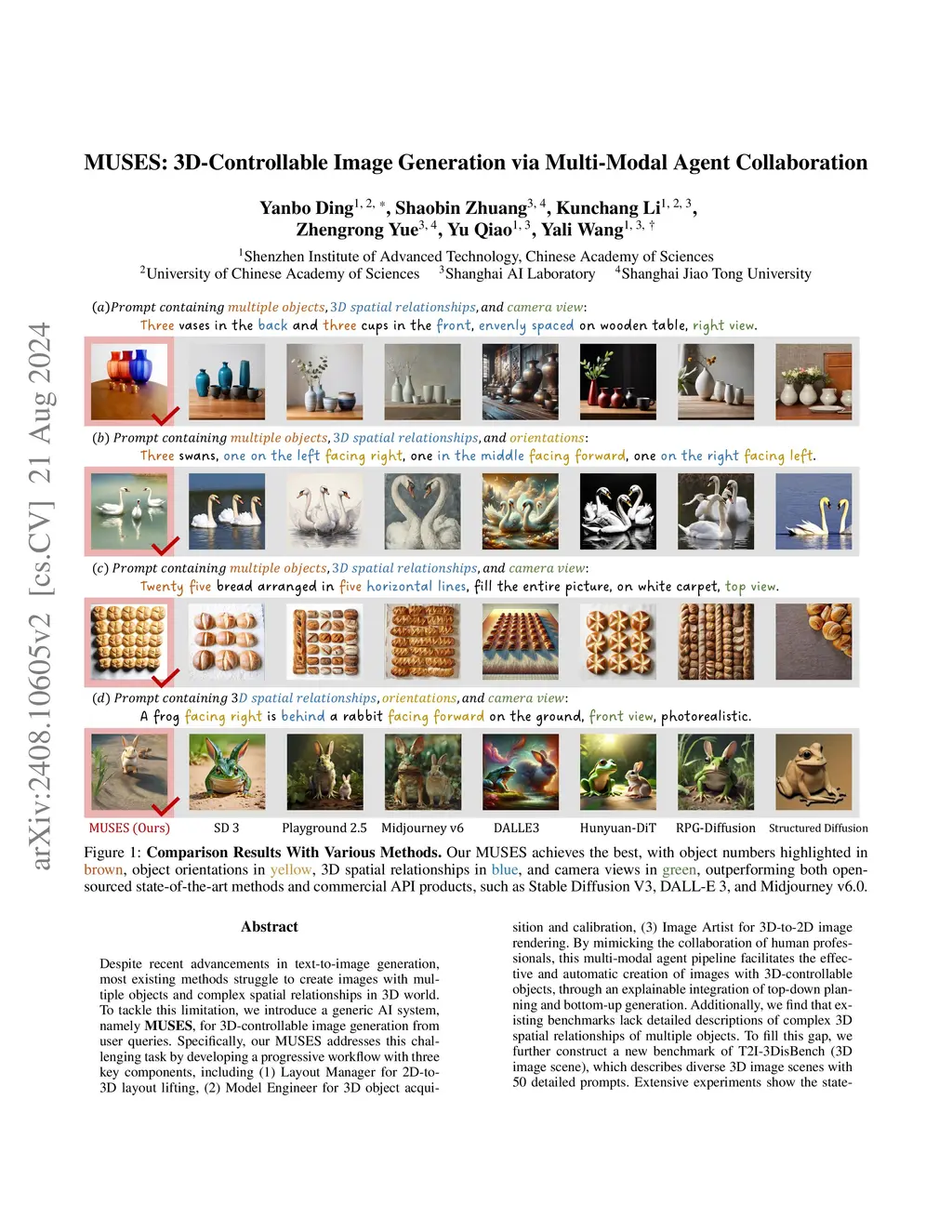 Despite recent advancements in text-to-image generation, most existing methods struggle to create images with multiple objects and complex spatial relationships in 3D world. To tackle this limitation, we introduce a generic AI system, namely MUSES, for 3D-controllable image generation from user queries. Specifically, our MUSES addresses this challenging task by developing a progressive workflow with three key components, including (1) Layout Manager for 2D-to-3D layout lifting, (2) Model Engineer for 3D object acquisition and calibration, (3) Image Artist for 3D-to-2D image rendering. By mimicking the collaboration of human professionals, this multi-modal agent pipeline facilitates the effective and automatic creation of images with 3D-controllable objects, through an explainable integration of top-down planning and bottom-up generation. Additionally, we find that existing benchmarks lack detailed descriptions of complex 3D spatial relationships of multiple objects. To fill this gap, we further construct a new benchmark of T2I-3DisBench (3D image scene), which describes diverse 3D image scenes with 50 detailed prompts. Extensive experiments show the state-of-the-art performance of MUSES on both T2I-CompBench and T2I-3DisBench, outperforming recent strong competitors such as DALL-E 3 and Stable Diffusion 3. These results demonstrate a significant step of MUSES forward in bridging natural language, 2D image generation, and 3D world.