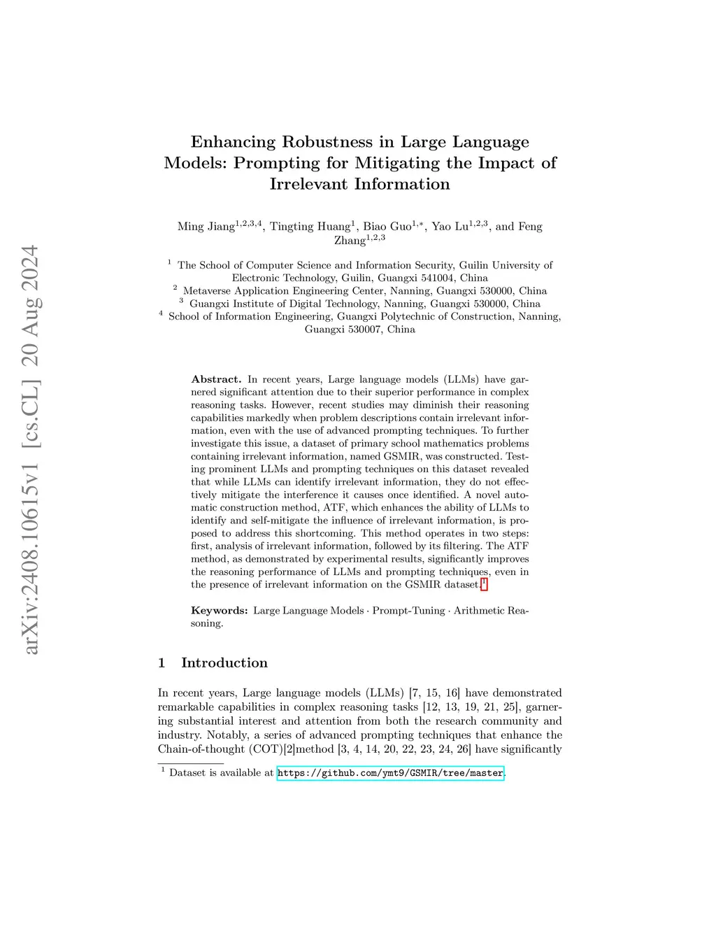 In recent years, Large language models (LLMs) have garnered significant attention due to their superior performance in complex reasoning tasks. However, recent studies may diminish their reasoning capabilities markedly when problem descriptions contain irrelevant information, even with the use of advanced prompting techniques. To further investigate this issue, a dataset of primary school mathematics problems containing irrelevant information, named GSMIR, was constructed. Testing prominent LLMs and prompting techniques on this dataset revealed that while LLMs can identify irrelevant information, they do not effectively mitigate the interference it causes once identified. A novel automatic construction method, ATF, which enhances the ability of LLMs to identify and self-mitigate the influence of irrelevant information, is proposed to address this shortcoming. This method operates in two steps: first, analysis of irrelevant information, followed by its filtering. The ATF method, as demonstrated by experimental results, significantly improves the reasoning performance of LLMs and prompting techniques, even in the presence of irrelevant information on the GSMIR dataset.
