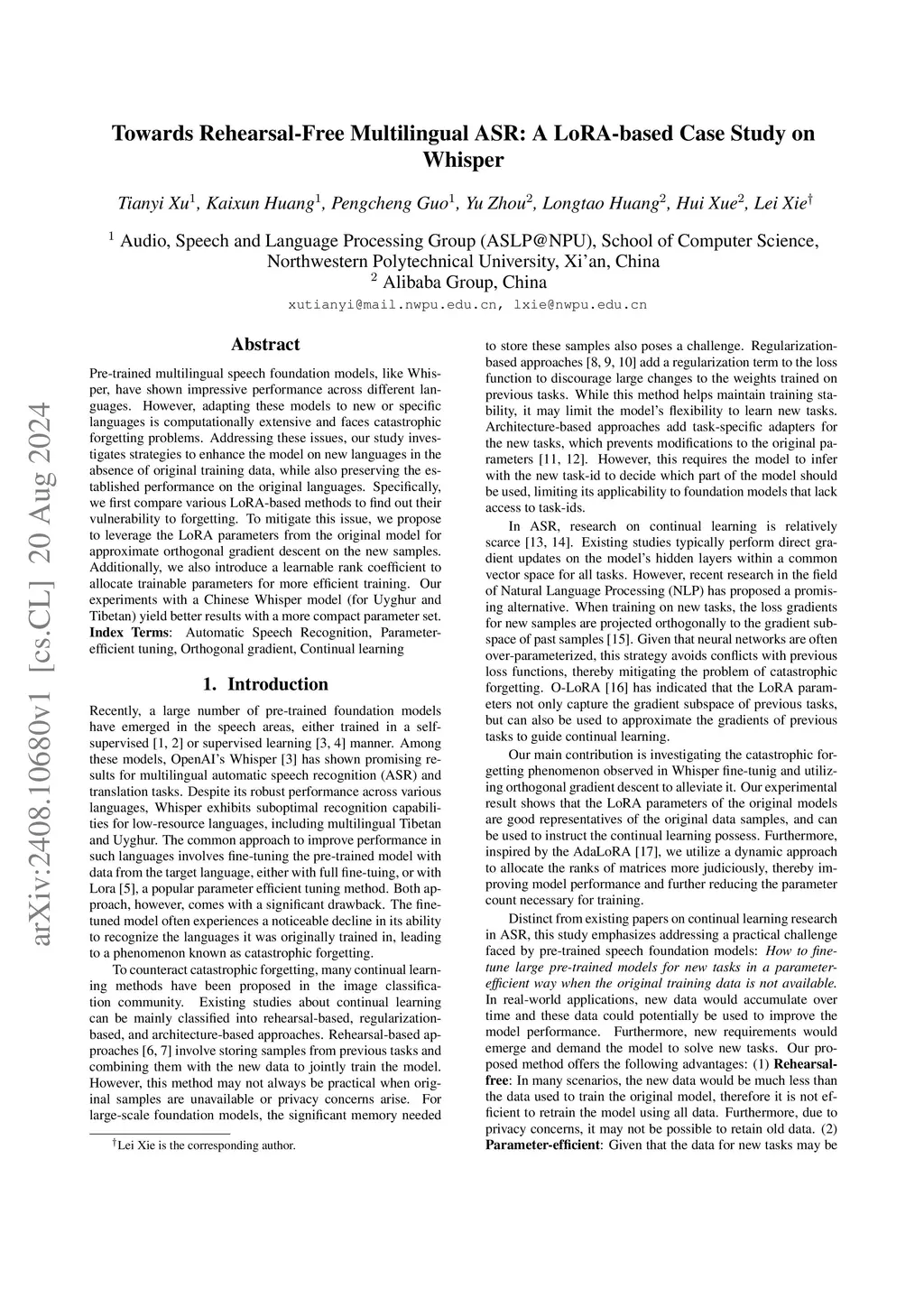 Pre-trained multilingual speech foundation models, like Whisper, have shown impressive performance across different languages. However, adapting these models to new or specific languages is computationally extensive and faces catastrophic forgetting problems. Addressing these issues, our study investigates strategies to enhance the model on new languages in the absence of original training data, while also preserving the established performance on the original languages. Specifically, we first compare various LoRA-based methods to find out their vulnerability to forgetting. To mitigate this issue, we propose to leverage the LoRA parameters from the original model for approximate orthogonal gradient descent on the new samples. Additionally, we also introduce a learnable rank coefficient to allocate trainable parameters for more efficient training. Our experiments with a Chinese Whisper model (for Uyghur and Tibetan) yield better results with a more compact parameter set.