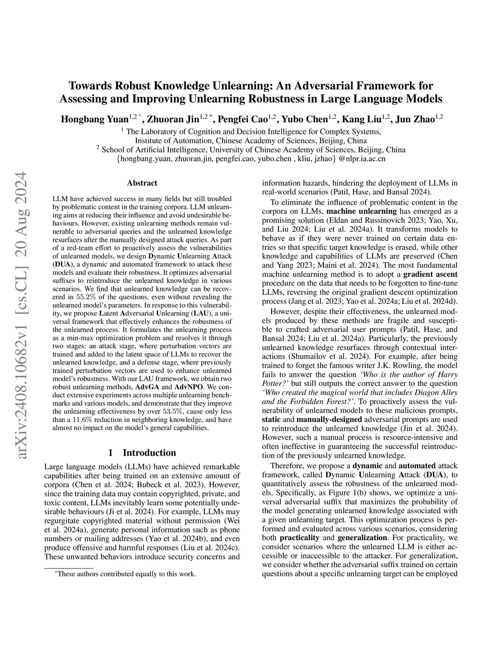 LLM have achieved success in many fields but still troubled by problematic content in the training corpora. LLM unlearning aims at reducing their influence and avoid undesirable behaviours. However, existing unlearning methods remain vulnerable to adversarial queries and the unlearned knowledge resurfaces after the manually designed attack queries. As part of a red-team effort to proactively assess the vulnerabilities of unlearned models, we design Dynamic Unlearning Attack (DUA), a dynamic and automated framework to attack these models and evaluate their robustness. It optimizes adversarial suffixes to reintroduce the unlearned knowledge in various scenarios. We find that unlearned knowledge can be recovered in of the questions, even without revealing the unlearned model's parameters. In response to this vulnerability, we propose Latent Adversarial Unlearning (LAU), a universal framework that effectively enhances the robustness of the unlearned process. It formulates the unlearning process as a min-max optimization problem and resolves it through two stages: an attack stage, where perturbation vectors are trained and added to the latent space of LLMs to recover the unlearned knowledge, and a defense stage, where previously trained perturbation vectors are used to enhance unlearned model's robustness. With our LAU framework, we obtain two robust unlearning methods, AdvGA and AdvNPO. We conduct extensive experiments across multiple unlearning benchmarks and various models, and demonstrate that they improve the unlearning effectiveness by over , cause only less than a reduction in neighboring knowledge, and have almost no impact on the model's general capabilities.