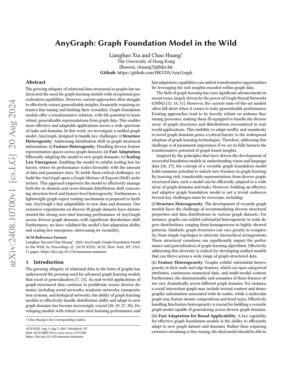 The growing ubiquity of relational data structured as graphs has underscored the need for graph learning models with exceptional generalization capabilities. However, current approaches often struggle to effectively extract generalizable insights, frequently requiring extensive fine-tuning and limiting their versatility. Graph foundation models offer a transformative solution, with the potential to learn robust, generalizable representations from graph data. This enables more effective and adaptable applications across a wide spectrum of tasks and domains. In this work, we investigate a unified graph model, AnyGraph, designed to handle key challenges: i) Structure Heterogenity. Addressing distribution shift in graph structural information; ii) Feature Heterogenity. Handling diverse feature representation spaces across graph datasets; iii) Fast Adaptation. Efficiently adapting the model to new graph domains; iv) Scaling Law Emergence. Enabling the model to exhibit scaling law behavior, where its performance scales favorably with the amount of data and parameter sizes. To tackle these critical challenges, we build the AnyGraph upon a Graph Mixture-of-Experts (MoE) architecture. This approach empowers the model to effectively manage both the in-domain and cross-domain distribution shift concerning structure-level and feature-level heterogeneity. Furthermore, a lightweight graph expert routing mechanism is proposed to facilitate AnyGraph's fast adaptability to new data and domains. Our extensive experiments on diverse 38 graph datasets have demonstrated the strong zero-shot learning performance of AnyGraph across diverse graph domains with significant distribution shift. Furthermore, we have validated the model's fast adaptation ability and scaling law emergence, showcasing its versatility.