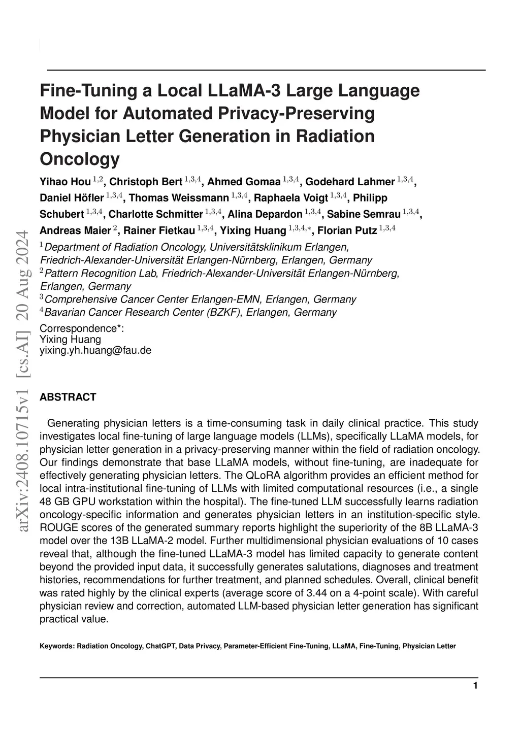 Generating physician letters is a time-consuming task in daily clinical practice. This study investigates local fine-tuning of large language models (LLMs), specifically LLaMA models, for physician letter generation in a privacy-preserving manner within the field of radiation oncology. Our findings demonstrate that base LLaMA models, without fine-tuning, are inadequate for effectively generating physician letters. The QLoRA algorithm provides an efficient method for local intra-institutional fine-tuning of LLMs with limited computational resources (i.e., a single 48 GB GPU workstation within the hospital). The fine-tuned LLM successfully learns radiation oncology-specific information and generates physician letters in an institution-specific style. ROUGE scores of the generated summary reports highlight the superiority of the 8B LLaMA-3 model over the 13B LLaMA-2 model. Further multidimensional physician evaluations of 10 cases reveal that, although the fine-tuned LLaMA-3 model has limited capacity to generate content beyond the provided input data, it successfully generates salutations, diagnoses and treatment histories, recommendations for further treatment, and planned schedules. Overall, clinical benefit was rated highly by the clinical experts (average score of 3.44 on a 4-point scale). With careful physician review and correction, automated LLM-based physician letter generation has significant practical value.