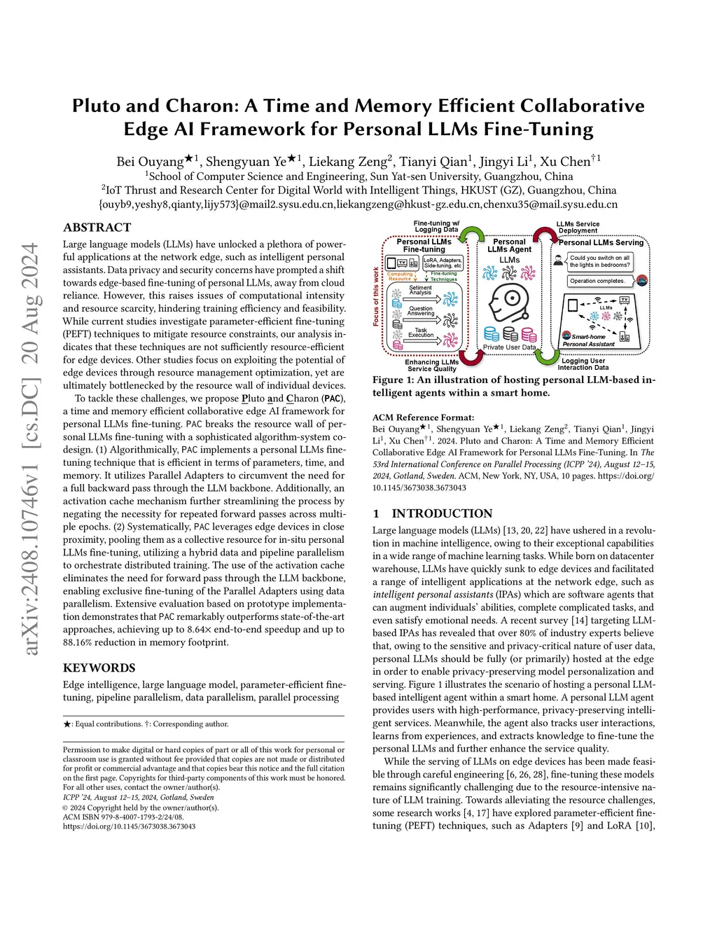 Large language models (LLMs) have unlocked a plethora of powerful applications at the network edge, such as intelligent personal assistants. Data privacy and security concerns have prompted a shift towards edge-based fine-tuning of personal LLMs, away from cloud reliance. However, this raises issues of computational intensity and resource scarcity, hindering training efficiency and feasibility. While current studies investigate parameter-efficient fine-tuning (PEFT) techniques to mitigate resource constraints, our analysis indicates that these techniques are not sufficiently resource-efficient for edge devices. To tackle these challenges, we propose Pluto and Charon (PAC), a time and memory efficient collaborative edge AI framework for personal LLMs fine-tuning. PAC breaks the resource wall of personal LLMs fine-tuning with a sophisticated algorithm-system co-design. (1) Algorithmically, PAC implements a personal LLMs fine-tuning technique that is efficient in terms of parameters, time, and memory. It utilizes Parallel Adapters to circumvent the need for a full backward pass through the LLM backbone. Additionally, an activation cache mechanism further streamlining the process by negating the necessity for repeated forward passes across multiple epochs. (2) Systematically, PAC leverages edge devices in close proximity, pooling them as a collective resource for in-situ personal LLMs fine-tuning, utilizing a hybrid data and pipeline parallelism to orchestrate distributed training. The use of the activation cache eliminates the need for forward pass through the LLM backbone,enabling exclusive fine-tuning of the Parallel Adapters using data parallelism. Extensive evaluation based on prototype implementation demonstrates that PAC remarkably outperforms state-of-the-art approaches, achieving up to 8.64x end-to-end speedup and up to 88.16% reduction in memory footprint.