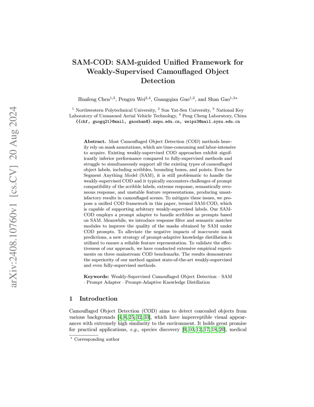 Most Camouflaged Object Detection (COD) methods heavily rely on mask annotations, which are time-consuming and labor-intensive to acquire. Existing weakly-supervised COD approaches exhibit significantly inferior performance compared to fully-supervised methods and struggle to simultaneously support all the existing types of camouflaged object labels, including scribbles, bounding boxes, and points. Even for Segment Anything Model (SAM), it is still problematic to handle the weakly-supervised COD and it typically encounters challenges of prompt compatibility of the scribble labels, extreme response, semantically erroneous response, and unstable feature representations, producing unsatisfactory results in camouflaged scenes. To mitigate these issues, we propose a unified COD framework in this paper, termed SAM-COD, which is capable of supporting arbitrary weakly-supervised labels. Our SAM-COD employs a prompt adapter to handle scribbles as prompts based on SAM. Meanwhile, we introduce response filter and semantic matcher modules to improve the quality of the masks obtained by SAM under COD prompts. To alleviate the negative impacts of inaccurate mask predictions, a new strategy of prompt-adaptive knowledge distillation is utilized to ensure a reliable feature representation. To validate the effectiveness of our approach, we have conducted extensive empirical experiments on three mainstream COD benchmarks. The results demonstrate the superiority of our method against state-of-the-art weakly-supervised and even fully-supervised methods.