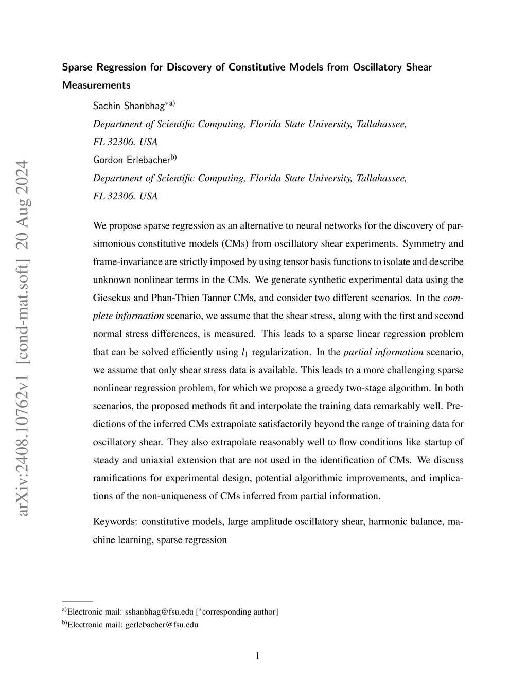 We propose sparse regression as an alternative to neural networks for the discovery of parsimonious constitutive models (CMs) from oscillatory shear experiments. Symmetry and frame-invariance are strictly imposed by using tensor basis functions to isolate and describe unknown nonlinear terms in the CMs. We generate synthetic experimental data using the Giesekus and Phan-Thien Tanner CMs, and consider two different scenarios. In the complete information scenario, we assume that the shear stress, along with the first and second normal stress differences, is measured. This leads to a sparse linear regression problem that can be solved efficiently using regularization. In the partial information scenario, we assume that only shear stress data is available. This leads to a more challenging sparse nonlinear regression problem, for which we propose a greedy two-stage algorithm. In both scenarios, the proposed methods fit and interpolate the training data remarkably well. Predictions of the inferred CMs extrapolate satisfactorily beyond the range of training data for oscillatory shear. They also extrapolate reasonably well to flow conditions like startup of steady and uniaxial extension that are not used in the identification of CMs. We discuss ramifications for experimental design, potential algorithmic improvements, and implications of the non-uniqueness of CMs inferred from partial information.