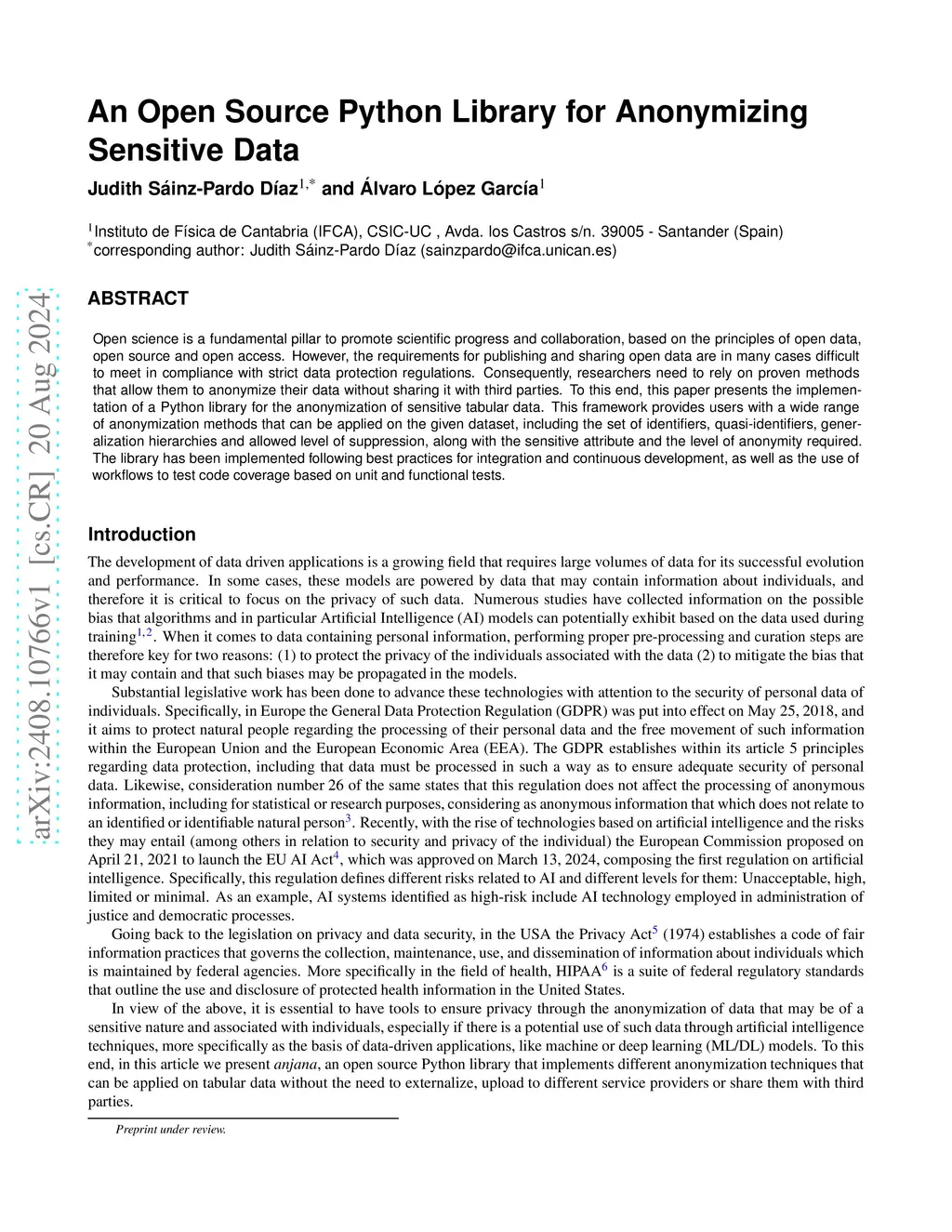 Open science is a fundamental pillar to promote scientific progress and collaboration, based on the principles of open data, open source and open access. However, the requirements for publishing and sharing open data are in many cases difficult to meet in compliance with strict data protection regulations. Consequently, researchers need to rely on proven methods that allow them to anonymize their data without sharing it with third parties. To this end, this paper presents the implementation of a Python library for the anonymization of sensitive tabular data. This framework provides users with a wide range of anonymization methods that can be applied on the given dataset, including the set of identifiers, quasi-identifiers, generalization hierarchies and allowed level of suppression, along with the sensitive attribute and the level of anonymity required. The library has been implemented following best practices for integration and continuous development, as well as the use of workflows to test code coverage based on unit and functional tests.