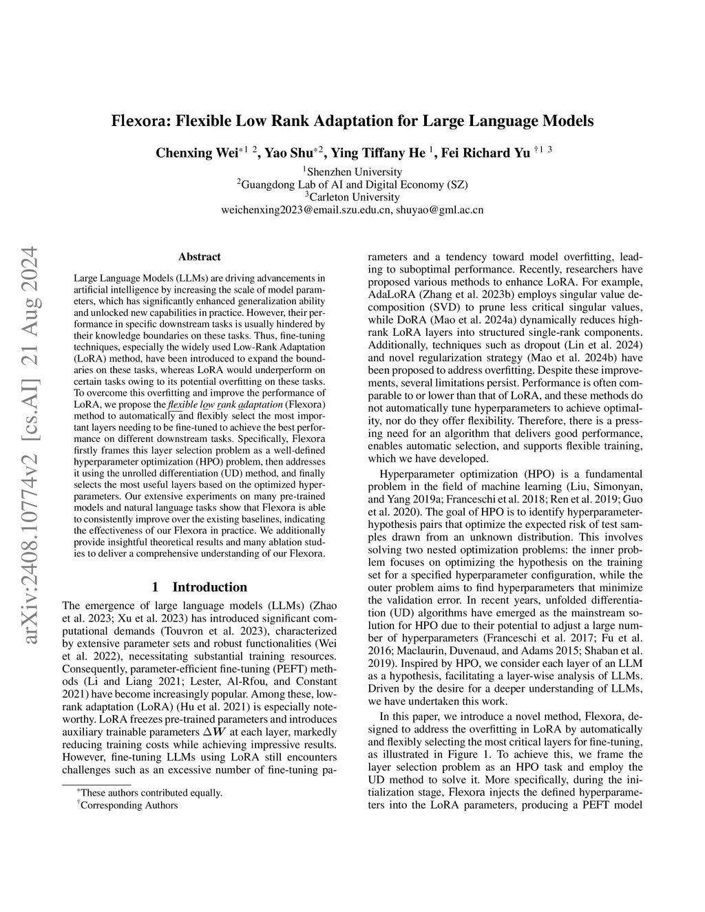 Large Language Models (LLMs) are driving advancements in artificial intelligence by increasing the scale of model parameters, which has significantly enhanced generalization ability and unlocked new capabilities in practice. However, their performance in specific downstream tasks is usually hindered by their knowledge boundaries on these tasks. Thus, fine-tuning techniques, especially the widely used Low-Rank Adaptation (LoRA) method, have been introduced to expand the boundaries on these tasks, whereas LoRA would underperform on certain tasks owing to its potential overfitting on these tasks. To overcome this overfitting and improve the performance of LoRA, we propose the flexible low rank adaptation (Flexora) method to automatically and flexibly select the most important layers needing to be fine-tuned to achieve the best performance on different downstream tasks. Specifically, Flexora firstly frames this layer selection problem as a well-defined hyperparameter optimization (HPO) problem, then addresses it using the unrolled differentiation (UD) method, and finally selects the most useful layers based on the optimized hyperparameters. Our extensive experiments on many pretrained models and natural language tasks show that Flexora is able to consistently improve over the existing baselines, indicating the effectiveness of our Flexora in practice. We additionally provide insightful theoretical results and many ablation studies to deliver a comprehensive understanding of our Flexora.