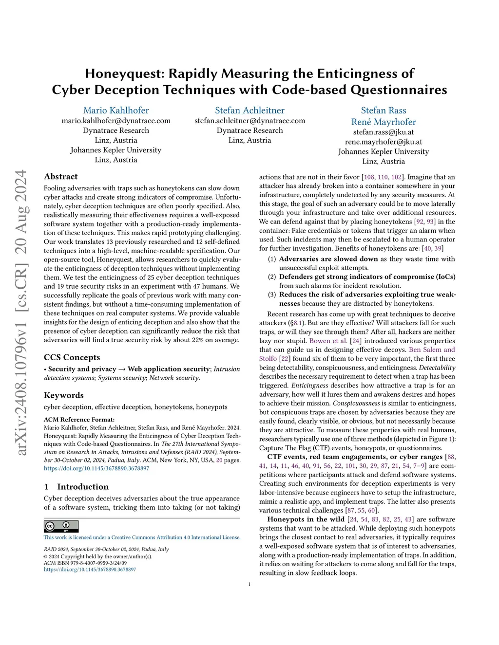 Fooling adversaries with traps such as honeytokens can slow down cyber attacks and create strong indicators of compromise. Unfortunately, cyber deception techniques are often poorly specified. Also, realistically measuring their effectiveness requires a well-exposed software system together with a production-ready implementation of these techniques. This makes rapid prototyping challenging. Our work translates 13 previously researched and 12 self-defined techniques into a high-level, machine-readable specification. Our open-source tool, Honeyquest, allows researchers to quickly evaluate the enticingness of deception techniques without implementing them. We test the enticingness of 25 cyber deception techniques and 19 true security risks in an experiment with 47 humans. We successfully replicate the goals of previous work with many consistent findings, but without a time-consuming implementation of these techniques on real computer systems. We provide valuable insights for the design of enticing deception and also show that the presence of cyber deception can significantly reduce the risk that adversaries will find a true security risk by about 22% on average.