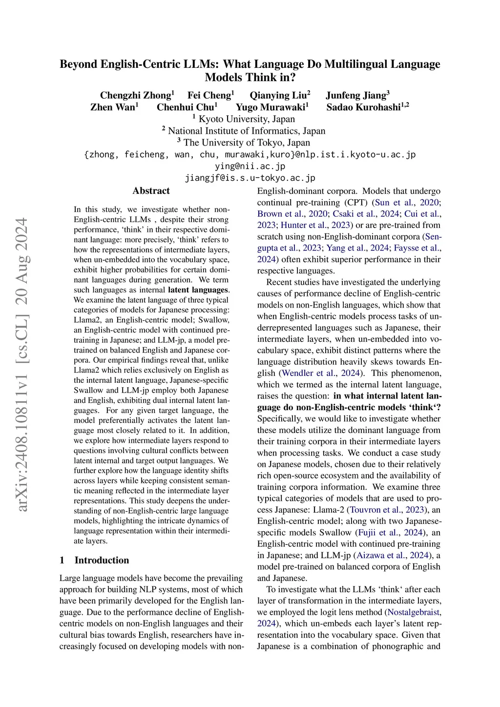 In this study, we investigate whether non-English-centric LLMs, despite their strong performance, `think' in their respective dominant language: more precisely, `think' refers to how the representations of intermediate layers, when un-embedded into the vocabulary space, exhibit higher probabilities for certain dominant languages during generation. We term such languages as internal . We examine the latent language of three typical categories of models for Japanese processing: Llama2, an English-centric model; Swallow, an English-centric model with continued pre-training in Japanese; and LLM-jp, a model pre-trained on balanced English and Japanese corpora. Our empirical findings reveal that, unlike Llama2 which relies exclusively on English as the internal latent language, Japanese-specific Swallow and LLM-jp employ both Japanese and English, exhibiting dual internal latent languages. For any given target language, the model preferentially activates the latent language most closely related to it. In addition, we explore how intermediate layers respond to questions involving cultural conflicts between latent internal and target output languages. We further explore how the language identity shifts across layers while keeping consistent semantic meaning reflected in the intermediate layer representations. This study deepens the understanding of non-English-centric large language models, highlighting the intricate dynamics of language representation within their intermediate layers.