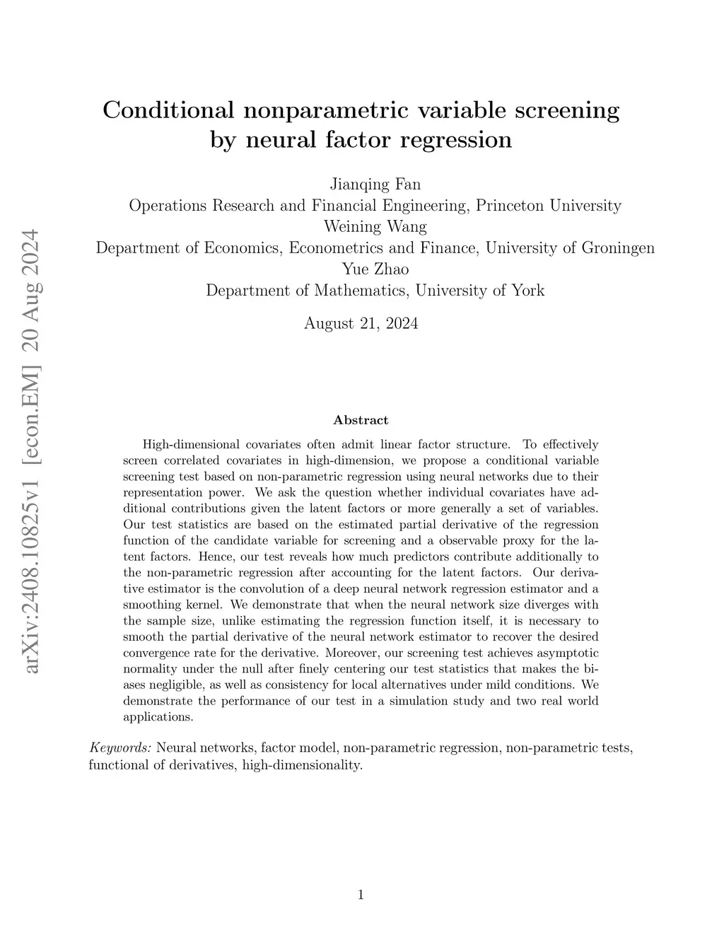 Conditional nonparametric variable screening by neural factor regression