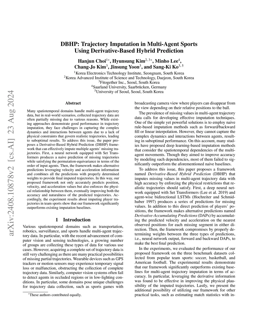 Multi-agent trajectory data collected from domains such as team sports often suffer from missing values due to various factors. While many imputation methods have been proposed for spatiotemporal data, they are not well-suited for multi-agent sports scenarios where player movements are highly dynamic and inter-agent interactions continuously evolve. To address these challenges, we propose MIDAS (Multi-agent Imputer with Derivative-Accumulating Self-ensemble), a framework that imputes multi-agent trajectories with high accuracy and physical plausibility. It jointly predicts positions, velocities, and accelerations through a Set Transformer-based neural network and generates alternative estimates by recursively accumulating predicted velocity and acceleration values. These predictions are then combined using a learnable weighted ensemble to produce final imputed trajectories. Experiments on three sports datasets demonstrate that MIDAS significantly outperforms existing baselines in both positional accuracy and physical plausibility. Lastly, we showcase use cases of MIDAS, such as approximating total distance and pass success probability, to highlight its applicability to practical downstream tasks that require complete tracking data.