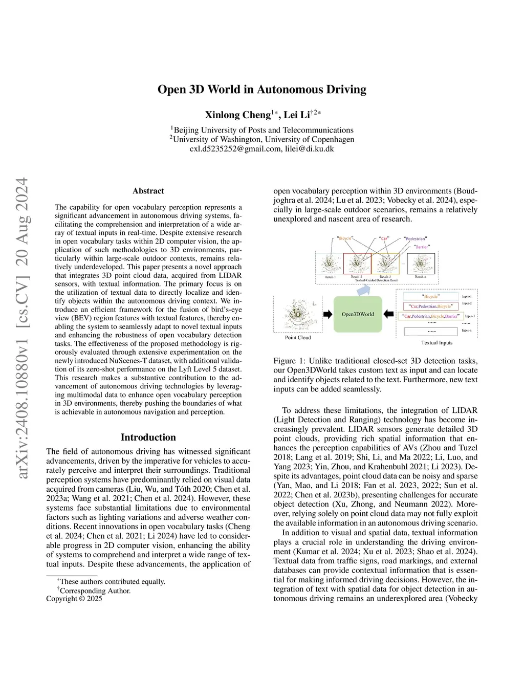 The capability for open vocabulary perception represents a significant advancement in autonomous driving systems, facilitating the comprehension and interpretation of a wide array of textual inputs in real-time. Despite extensive research in open vocabulary tasks within 2D computer vision, the application of such methodologies to 3D environments, particularly within large-scale outdoor contexts, remains relatively underdeveloped. This paper presents a novel approach that integrates 3D point cloud data, acquired from LIDAR sensors, with textual information. The primary focus is on the utilization of textual data to directly localize and identify objects within the autonomous driving context. We introduce an efficient framework for the fusion of bird's-eye view (BEV) region features with textual features, thereby enabling the system to seamlessly adapt to novel textual inputs and enhancing the robustness of open vocabulary detection tasks. The effectiveness of the proposed methodology is rigorously evaluated through extensive experimentation on the newly introduced NuScenes-T dataset, with additional validation of its zero-shot performance on the Lyft Level 5 dataset. This research makes a substantive contribution to the advancement of autonomous driving technologies by leveraging multimodal data to enhance open vocabulary perception in 3D environments, thereby pushing the boundaries of what is achievable in autonomous navigation and perception.