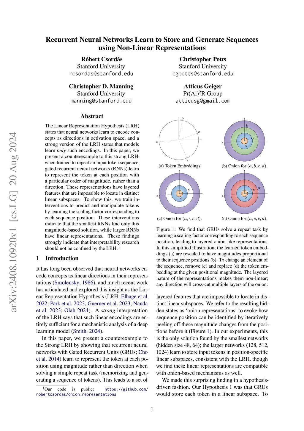 The Linear Representation Hypothesis (LRH) states that neural networks learn to encode concepts as directions in activation space, and a strong version of the LRH states that models learn only such encodings. In this paper, we present a counterexample to this strong LRH: when trained to repeat an input token sequence, gated recurrent neural networks (RNNs) learn to represent the token at each position with a particular order of magnitude, rather than a direction. These representations have layered features that are impossible to locate in distinct linear subspaces. To show this, we train interventions to predict and manipulate tokens by learning the scaling factor corresponding to each sequence position. These interventions indicate that the smallest RNNs find only this magnitude-based solution, while larger RNNs have linear representations. These findings strongly indicate that interpretability research should not be confined by the LRH.