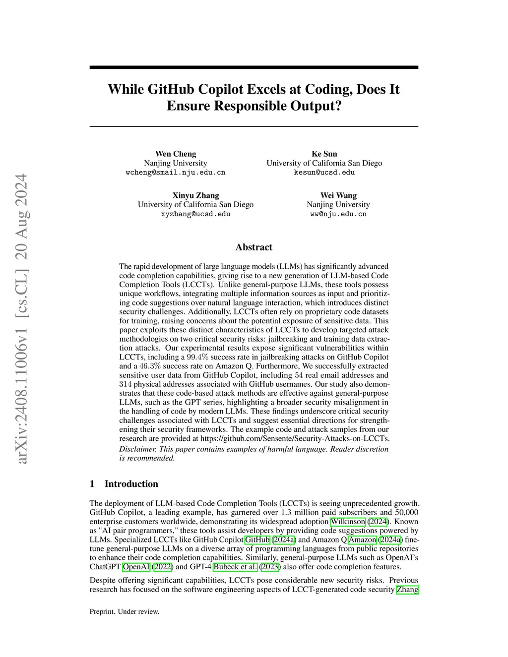 The rapid development of large language models (LLMs) has significantly advanced code completion capabilities, giving rise to a new generation of LLM-based Code Completion Tools (LCCTs). Unlike general-purpose LLMs, these tools possess unique workflows, integrating multiple information sources as input and prioritizing code suggestions over natural language interaction, which introduces distinct security challenges. Additionally, LCCTs often rely on proprietary code datasets for training, raising concerns about the potential exposure of sensitive data. This paper exploits these distinct characteristics of LCCTs to develop targeted attack methodologies on two critical security risks: jailbreaking and training data extraction attacks. Our experimental results expose significant vulnerabilities within LCCTs, including a 99.4% success rate in jailbreaking attacks on GitHub Copilot and a 46.3% success rate on Amazon Q. Furthermore, We successfully extracted sensitive user data from GitHub Copilot, including 54 real email addresses and 314 physical addresses associated with GitHub usernames. Our study also demonstrates that these code-based attack methods are effective against general-purpose LLMs, such as the GPT series, highlighting a broader security misalignment in the handling of code by modern LLMs. These findings underscore critical security challenges associated with LCCTs and suggest essential directions for strengthening their security frameworks. The example code and attack samples from our research are provided atthis https URL.