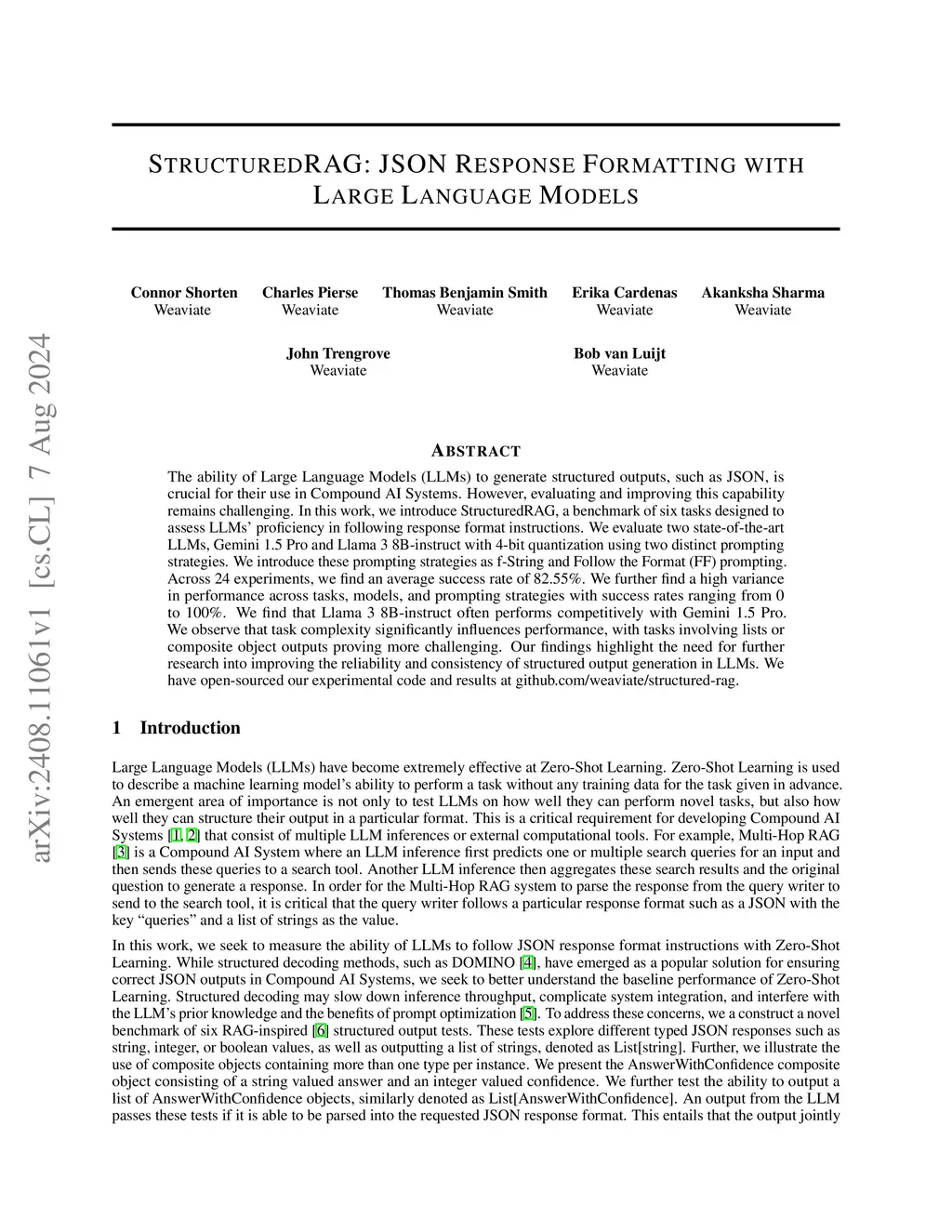StructuredRAG: JSON Response Formatting with Large Language Models