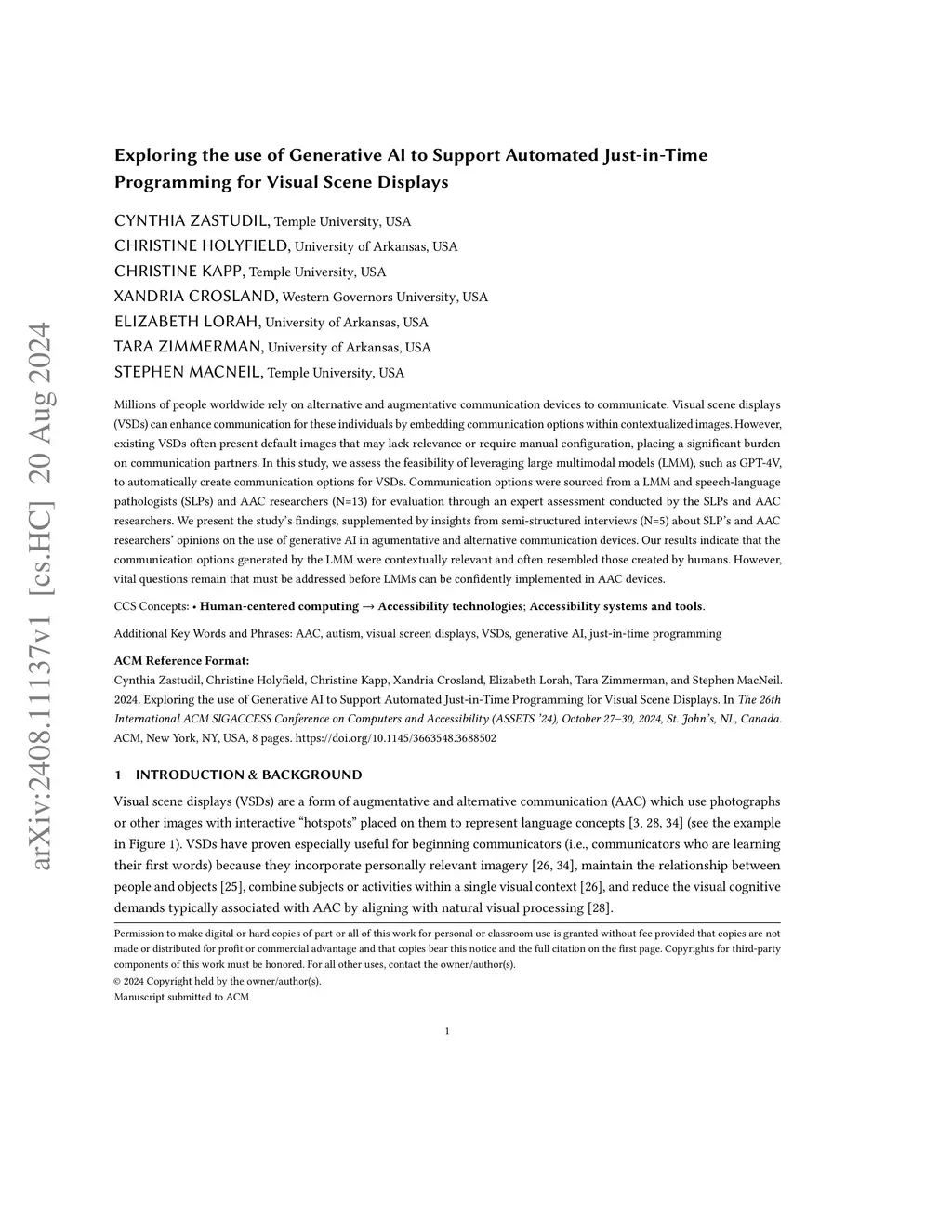 Millions of people worldwide rely on alternative and augmentative communication devices to communicate. Visual scene displays (VSDs) can enhance communication for these individuals by embedding communication options within contextualized images. However, existing VSDs often present default images that may lack relevance or require manual configuration, placing a significant burden on communication partners. In this study, we assess the feasibility of leveraging large multimodal models (LMM), such as GPT-4V, to automatically create communication options for VSDs. Communication options were sourced from a LMM and speech-language pathologists (SLPs) and AAC researchers (N=13) for evaluation through an expert assessment conducted by the SLPs and AAC researchers. We present the study's findings, supplemented by insights from semi-structured interviews (N=5) about SLP's and AAC researchers' opinions on the use of generative AI in augmentative and alternative communication devices. Our results indicate that the communication options generated by the LMM were contextually relevant and often resembled those created by humans. However, vital questions remain that must be addressed before LMMs can be confidently implemented in AAC devices.