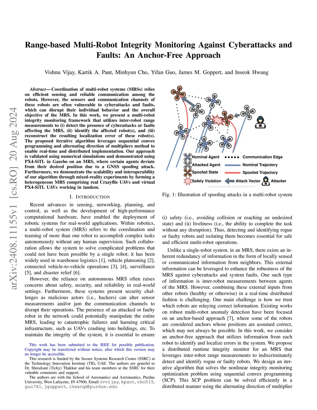 Coordination of multi-robot systems (MRSs) relies on efficient sensing and reliable communication among the robots. However, the sensors and communication channels of these robots are often vulnerable to cyberattacks and faults, which can disrupt their individual behavior and the overall objective of the MRS. In this work, we present a multi-robot integrity monitoring framework that utilizes inter-robot range measurements to (i) detect the presence of cyberattacks or faults affecting the MRS, (ii) identify the affected robot(s), and (iii) reconstruct the resulting localization error of these robot(s). The proposed iterative algorithm leverages sequential convex programming and alternating direction of multipliers method to enable real-time and distributed implementation. Our approach is validated using numerical simulations and demonstrated using PX4-SiTL in Gazebo on an MRS, where certain agents deviate from their desired position due to a GNSS spoofing attack. Furthermore, we demonstrate the scalability and interoperability of our algorithm through mixed-reality experiments by forming a heterogeneous MRS comprising real Crazyflie UAVs and virtual PX4-SiTL UAVs working in tandem.