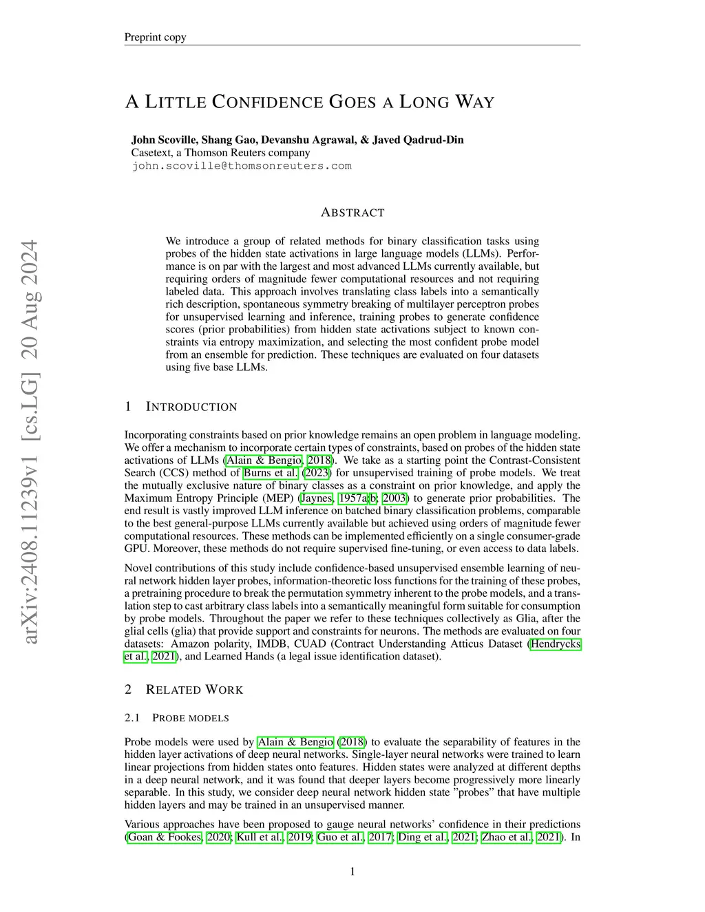 We introduce a group of related methods for binary classification tasks using probes of the hidden state activations in large language models (LLMs). Performance is on par with the largest and most advanced LLMs currently available, but requiring orders of magnitude fewer computational resources and not requiring labeled data. This approach involves translating class labels into a semantically rich description, spontaneous symmetry breaking of multilayer perceptron probes for unsupervised learning and inference, training probes to generate confidence scores (prior probabilities) from hidden state activations subject to known constraints via entropy maximization, and selecting the most confident probe model from an ensemble for prediction. These techniques are evaluated on four datasets using five base LLMs.
