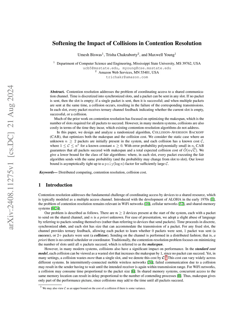 Contention resolution addresses the problem of coordinating access to a shared communication channel. Time is discretized into synchronized slots, and a packet can be sent in any slot. If no packet is sent, then the slot is empty; if a single packet is sent, then it is successful; and when multiple packets are sent at the same time, a collision occurs, resulting in the failure of the corresponding transmissions. In each slot, every packet receives ternary channel feedback indicating whether the current slot is empty, successful, or a collision. Much of the prior work on contention resolution has focused on optimizing the makespan, which is the number of slots required for all packets to succeed. However, in many modern systems, collisions are also costly in terms of the time they incur, which existing contention-resolution algorithms do not address. In this paper, we design and analyze a randomized algorithm, Collision Aversion Backoff (CAB), that optimizes both the makespan and the collision cost. We consider the static case where an unknown packets are initially present in the system, and each collision has a known cost , where for a known constant . With error probability polynomially small in , CAB guarantees that all packets succeed with makespan and a total expected collision cost of . We give a lower bound for the class of fair algorithms: where, in each slot, every packet executing the fair algorithm sends with the same probability (and the probability may change from slot to slot). Our lower bound is asymptotically tight up to a -factor for sufficiently large .