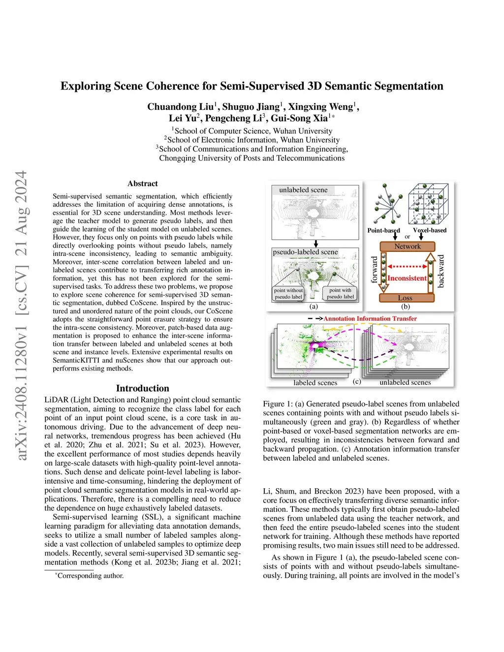 This paper explores scene affinity (AIScene), namely intra-scene consistency and inter-scene correlation, for semi-supervised LiDAR semantic segmentation in driving scenes. Adopting teacher-student training, AIScene employs a teacher network to generate pseudo-labeled scenes from unlabeled data, which then supervise the student network's learning. Unlike most methods that include all points in pseudo-labeled scenes for forward propagation but only pseudo-labeled points for backpropagation, AIScene removes points without pseudo-labels, ensuring consistency in both forward and backward propagation within the scene. This simple point erasure strategy effectively prevents unsupervised, semantically ambiguous points (excluded in backpropagation) from affecting the learning of pseudo-labeled points. Moreover, AIScene incorporates patch-based data augmentation, mixing multiple scenes at both scene and instance levels. Compared to existing augmentation techniques that typically perform scene-level mixing between two scenes, our method enhances the semantic diversity of labeled (or pseudo-labeled) scenes, thereby improving the semi-supervised performance of segmentation models. Experiments show that AIScene outperforms previous methods on two popular benchmarks across four settings, achieving notable improvements of 1.9% and 2.1% in the most challenging 1% labeled data.