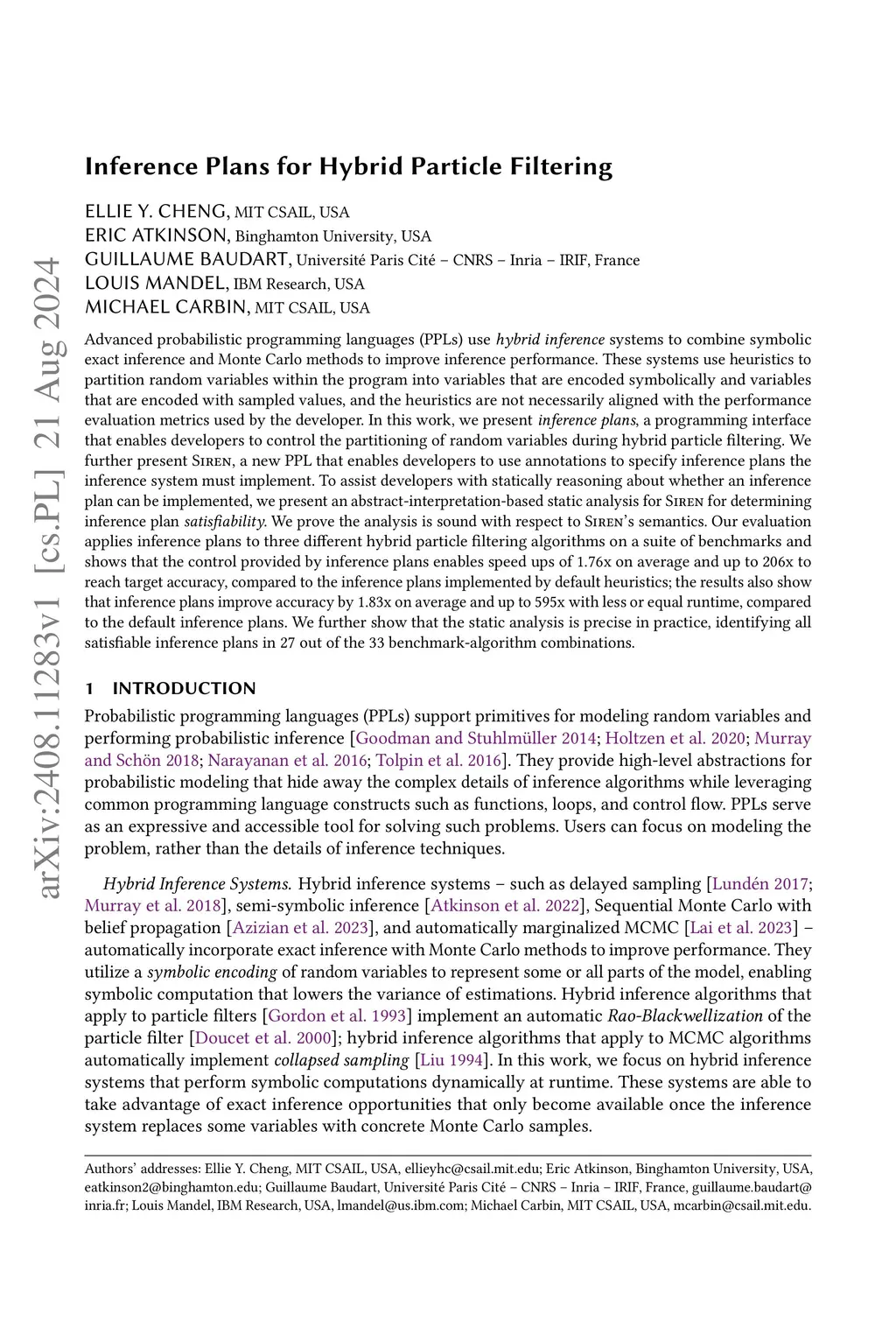 Advanced probabilistic programming languages (PPLs) use hybrid inference systems to combine symbolic exact inference and Monte Carlo methods to improve inference performance. These systems use heuristics to partition random variables within the program into variables that are encoded symbolically and variables that are encoded with sampled values, and the heuristics are not necessarily aligned with the performance evaluation metrics used by the developer. In this work, we present inference plans, a programming interface that enables developers to control the partitioning of random variables during hybrid particle filtering. We further present Siren, a new PPL that enables developers to use annotations to specify inference plans the inference system must implement. To assist developers with statically reasoning about whether an inference plan can be implemented, we present an abstract-interpretation-based static analysis for Siren for determining inference plan satisfiability. We prove the analysis is sound with respect to Siren's semantics. Our evaluation applies inference plans to three different hybrid particle filtering algorithms on a suite of benchmarks and shows that the control provided by inference plans enables speed ups of 1.76x on average and up to 206x to reach target accuracy, compared to the inference plans implemented by default heuristics; the results also show that inference plans improve accuracy by 1.83x on average and up to 595x with less or equal runtime, compared to the default inference plans. We further show that the static analysis is precise in practice, identifying all satisfiable inference plans in 27 out of the 33 benchmark-algorithm combinations.