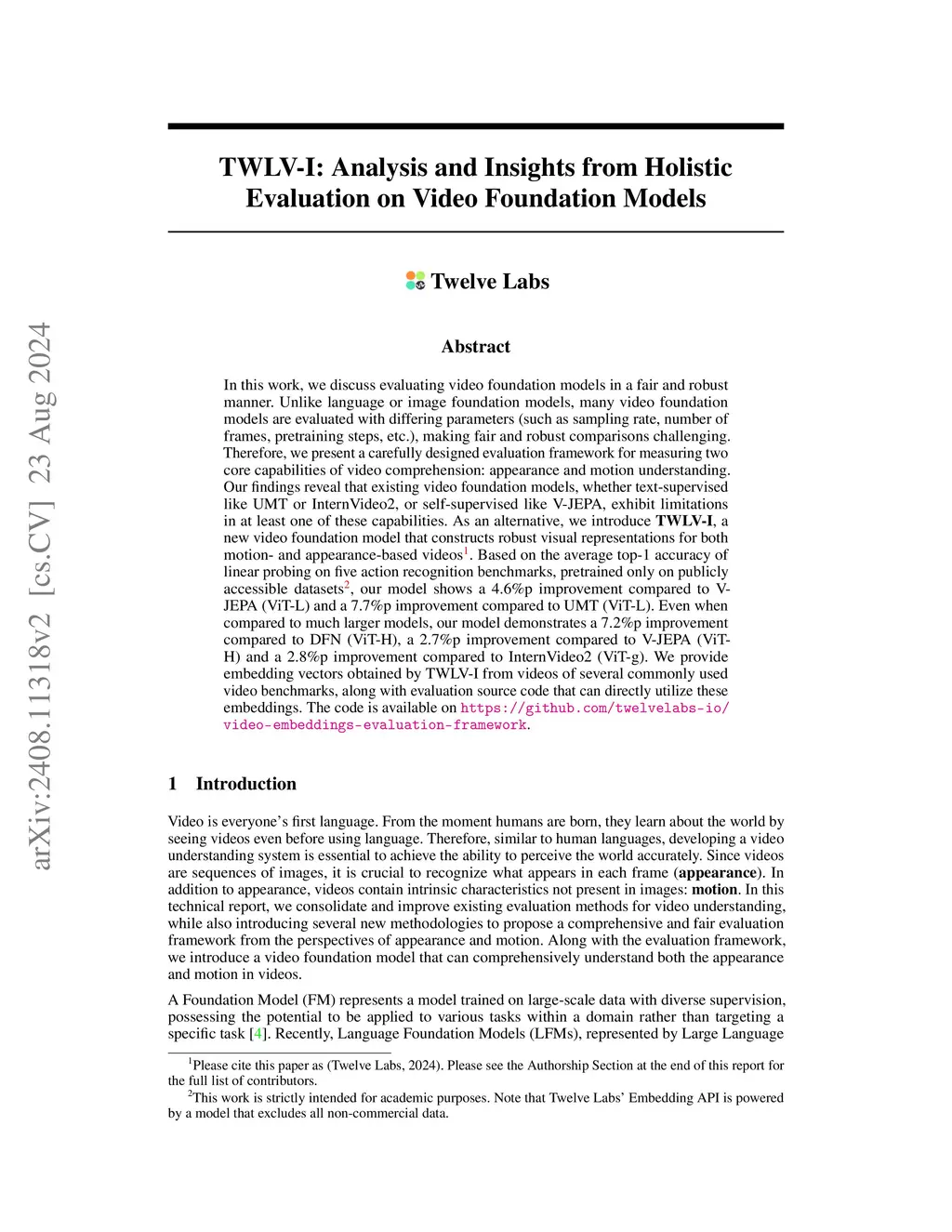 In this work, we discuss evaluating video foundation models in a fair and robust manner. Unlike language or image foundation models, many video foundation models are evaluated with differing parameters (such as sampling rate, number of frames, pretraining steps, etc.), making fair and robust comparisons challenging. Therefore, we present a carefully designed evaluation framework for measuring two core capabilities of video comprehension: appearance and motion understanding. Our findings reveal that existing video foundation models, whether text-supervised like UMT or InternVideo2, or self-supervised like V-JEPA, exhibit limitations in at least one of these capabilities. As an alternative, we introduce TWLV-I, a new video foundation model that constructs robust visual representations for both motion- and appearance-based videos. Based on the average top-1 accuracy of linear probing on five action recognition benchmarks, pretrained only on publicly accessible datasets, our model shows a 4.6%p improvement compared to V-JEPA (ViT-L) and a 7.7%p improvement compared to UMT (ViT-L). Even when compared to much larger models, our model demonstrates a 7.2%p improvement compared to DFN (ViT-H), a 2.7%p improvement compared to V-JEPA (ViT-H) and a 2.8%p improvement compared to InternVideo2 (ViT-g). We provide embedding vectors obtained by TWLV-I from videos of several commonly used video benchmarks, along with evaluation source code that can directly utilize these embeddings. The code is available at https://github.com/twelvelabs-io/video-embeddings-evaluation-framework.