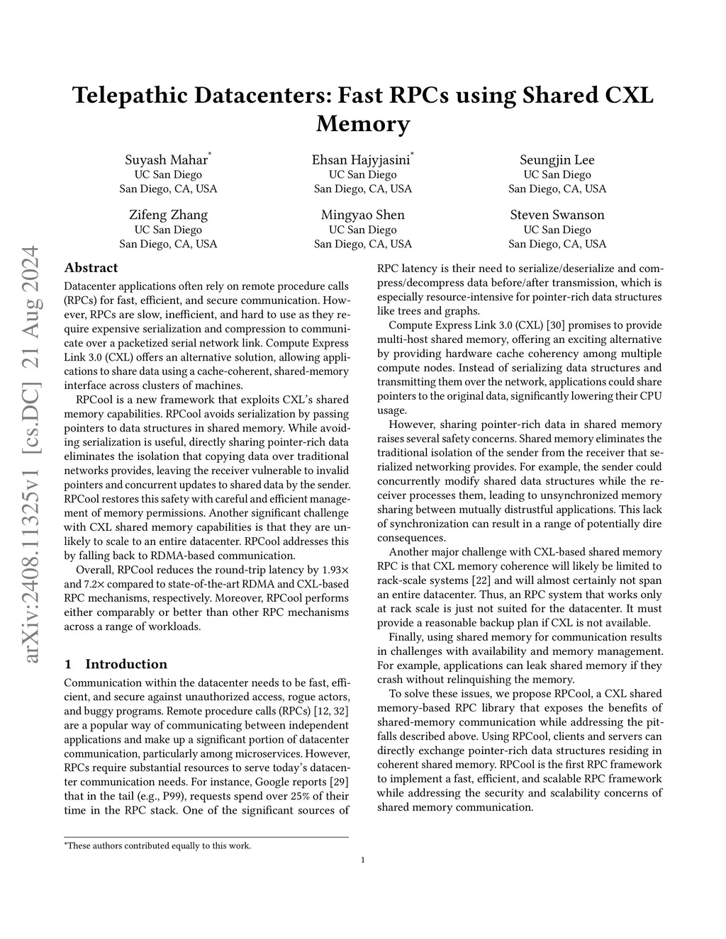 Datacenter applications often rely on remote procedure calls (RPCs) for fast, efficient, and secure communication. However, RPCs are slow, inefficient, and hard to use as they require expensive serialization and compression to communicate over a packetized serial network link. Compute Express Link 3.0 (CXL) offers an alternative solution, allowing applications to share data using a cache-coherent, shared-memory interface across clusters of machines. RPCool is a new framework that exploits CXL's shared memory capabilities. RPCool avoids serialization by passing pointers to data structures in shared memory. While avoiding serialization is useful, directly sharing pointer-rich data eliminates the isolation that copying data over traditional networks provides, leaving the receiver vulnerable to invalid pointers and concurrent updates to shared data by the sender. RPCool restores this safety with careful and efficient management of memory permissions. Another significant challenge with CXL shared memory capabilities is that they are unlikely to scale to an entire datacenter. RPCool addresses this by falling back to RDMA-based communication. Overall, RPCool reduces the round-trip latency by 1.93 and 7.2 compared to state-of-the-art RDMA and CXL-based RPC mechanisms, respectively. Moreover, RPCool performs either comparably or better than other RPC mechanisms across a range of workloads.