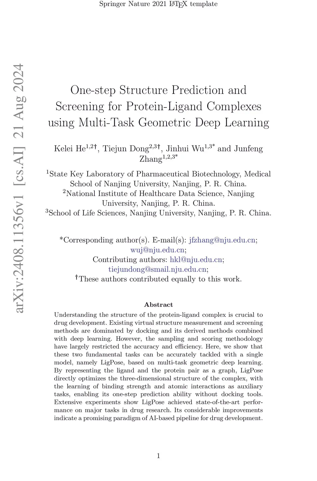 Understanding the structure of the protein-ligand complex is crucial to drug development. Existing virtual structure measurement and screening methods are dominated by docking and its derived methods combined with deep learning. However, the sampling and scoring methodology have largely restricted the accuracy and efficiency. Here, we show that these two fundamental tasks can be accurately tackled with a single model, namely LigPose, based on multi-task geometric deep learning. By representing the ligand and the protein pair as a graph, LigPose directly optimizes the three-dimensional structure of the complex, with the learning of binding strength and atomic interactions as auxiliary tasks, enabling its one-step prediction ability without docking tools. Extensive experiments show LigPose achieved state-of-the-art performance on major tasks in drug research. Its considerable improvements indicate a promising paradigm of AI-based pipeline for drug development.