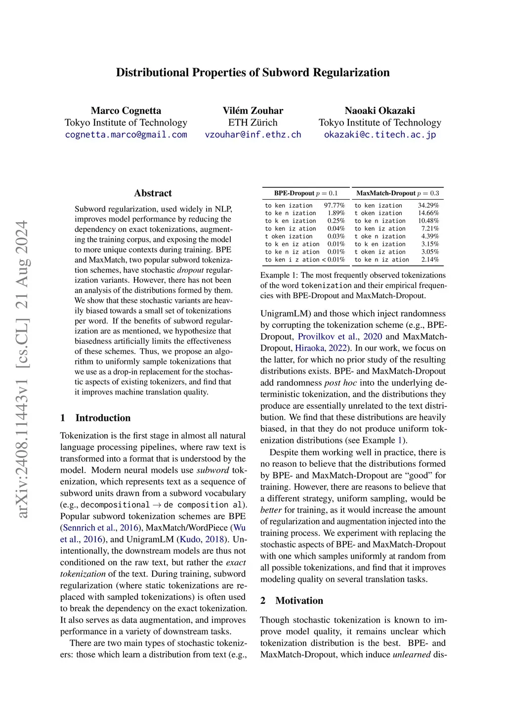 Subword regularization, used widely in NLP, improves model performance by reducing the dependency on exact tokenizations, augmenting the training corpus, and exposing the model to more unique contexts during training. BPE and MaxMatch, two popular subword tokenization schemes, have stochastic dropout regularization variants. However, there has not been an analysis of the distributions formed by them. We show that these stochastic variants are heavily biased towards a small set of tokenizations per word. If the benefits of subword regularization are as mentioned, we hypothesize that biasedness artificially limits the effectiveness of these schemes. Thus, we propose an algorithm to uniformly sample tokenizations that we use as a drop-in replacement for the stochastic aspects of existing tokenizers, and find that it improves machine translation quality.