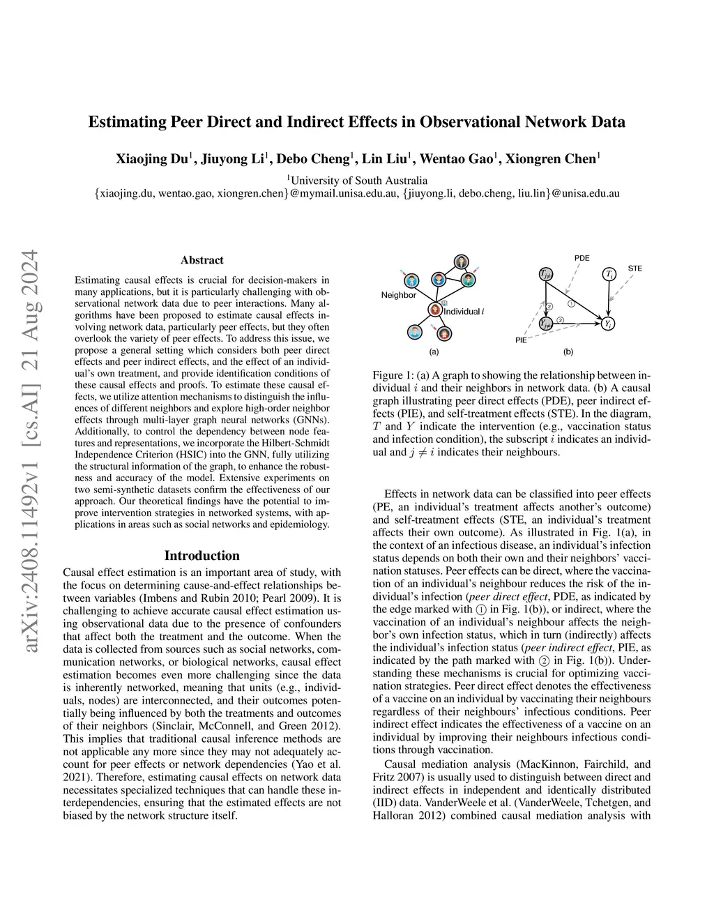 Estimating causal effects is crucial for decision-makers in many applications, but it is particularly challenging with observational network data due to peer interactions. Many algorithms have been proposed to estimate causal effects involving network data, particularly peer effects, but they often overlook the variety of peer effects. To address this issue, we propose a general setting which considers both peer direct effects and peer indirect effects, and the effect of an individual's own treatment, and provide identification conditions of these causal effects and proofs. To estimate these causal effects, we utilize attention mechanisms to distinguish the influences of different neighbors and explore high-order neighbor effects through multi-layer graph neural networks (GNNs). Additionally, to control the dependency between node features and representations, we incorporate the Hilbert-Schmidt Independence Criterion (HSIC) into the GNN, fully utilizing the structural information of the graph, to enhance the robustness and accuracy of the model. Extensive experiments on two semi-synthetic datasets confirm the effectiveness of our approach. Our theoretical findings have the potential to improve intervention strategies in networked systems, with applications in areas such as social networks and epidemiology.