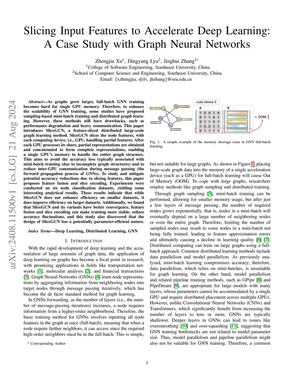 As graphs grow larger, full-batch GNN training becomes hard for single GPU memory. Therefore, to enhance the scalability of GNN training, some studies have proposed sampling-based mini-batch training and distributed graph learning. However, these methods still have drawbacks, such as performance degradation and heavy communication. This paper introduces SliceGCN, a feature-sliced distributed large-scale graph learning method. SliceGCN slices the node features, with each computing device, i.e., GPU, handling partial features. After each GPU processes its share, partial representations are obtained and concatenated to form complete representations, enabling a single GPU's memory to handle the entire graph structure. This aims to avoid the accuracy loss typically associated with mini-batch training (due to incomplete graph structures) and to reduce inter-GPU communication during message passing (the forward propagation process of GNNs). To study and mitigate potential accuracy reductions due to slicing features, this paper proposes feature fusion and slice encoding. Experiments were conducted on six node classification datasets, yielding some interesting analytical results. These results indicate that while SliceGCN does not enhance efficiency on smaller datasets, it does improve efficiency on larger datasets. Additionally, we found that SliceGCN and its variants have better convergence, feature fusion and slice encoding can make training more stable, reduce accuracy fluctuations, and this study also discovered that the design of SliceGCN has a potentially parameter-efficient nature.