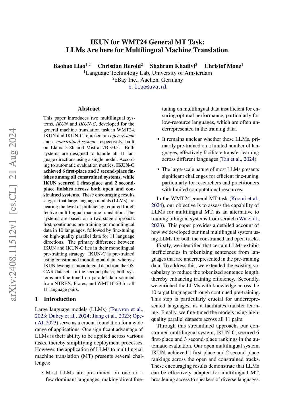 This paper introduces two multilingual systems, IKUN and IKUN-C, developed for the general machine translation task in WMT24. IKUN and IKUN-C represent an open system and a constrained system, respectively, built on Llama-3-8b and Mistral-7B-v0.3. Both systems are designed to handle all 11 language directions using a single model. According to automatic evaluation metrics, IKUN-C achieved 6 first-place and 3 second-place finishes among all constrained systems, while IKUN secured 1 first-place and 2 second-place finishes across both open and constrained systems. These encouraging results suggest that large language models (LLMs) are nearing the level of proficiency required for effective multilingual machine translation. The systems are based on a two-stage approach: first, continuous pre-training on monolingual data in 10 languages, followed by fine-tuning on high-quality parallel data for 11 language directions. The primary difference between IKUN and IKUN-C lies in their monolingual pre-training strategy. IKUN-C is pre-trained using constrained monolingual data, whereas IKUN leverages monolingual data from the OSCAR dataset. In the second phase, both systems are fine-tuned on parallel data sourced from NTREX, Flores, and WMT16-23 for all 11 language pairs.