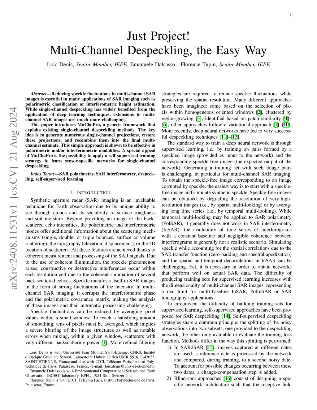 Reducing speckle fluctuations in multi-channel SAR images is essential in many applications of SAR imaging such as polarimetric classification or interferometric height estimation. While single-channel despeckling has widely benefited from the application of deep learning techniques, extensions to multi-channel SAR images are much more challenging. This paper introduces MuChaPro, a generic framework that exploits existing single-channel despeckling methods. The key idea is to generate numerous single-channel projections, restore these projections, and recombine them into the final multi-channel estimate. This simple approach is shown to be effective in polarimetric and/or interferometric modalities. A special appeal of MuChaPro is the possibility to apply a self-supervised training strategy to learn sensor-specific networks for single-channel despeckling.