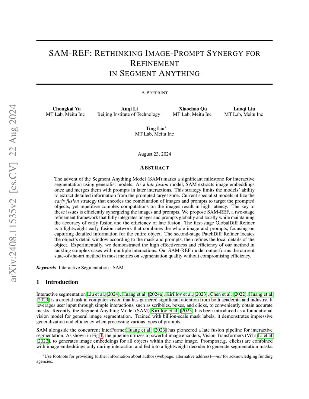 The advent of the Segment Anything Model (SAM) marks a significant milestone for interactive segmentation using generalist models. As a late fusion model, SAM extracts image embeddings once and merges them with prompts in later interactions. This strategy limits the models ability to extract detailed information from the prompted target zone. Current specialist models utilize the early fusion strategy that encodes the combination of images and prompts to target the prompted objects, yet repetitive complex computations on the images result in high latency. The key to these issues is efficiently synergizing the images and prompts. We propose SAM-REF, a two-stage refinement framework that fully integrates images and prompts globally and locally while maintaining the accuracy of early fusion and the efficiency of late fusion. The first-stage GlobalDiff Refiner is a lightweight early fusion network that combines the whole image and prompts, focusing on capturing detailed information for the entire object. The second-stage PatchDiff Refiner locates the object detail window according to the mask and prompts, then refines the local details of the object. Experimentally, we demonstrated the high effectiveness and efficiency of our method in tackling complex cases with multiple interactions. Our SAM-REF model outperforms the current state-of-the-art method in most metrics on segmentation quality without compromising efficiency.