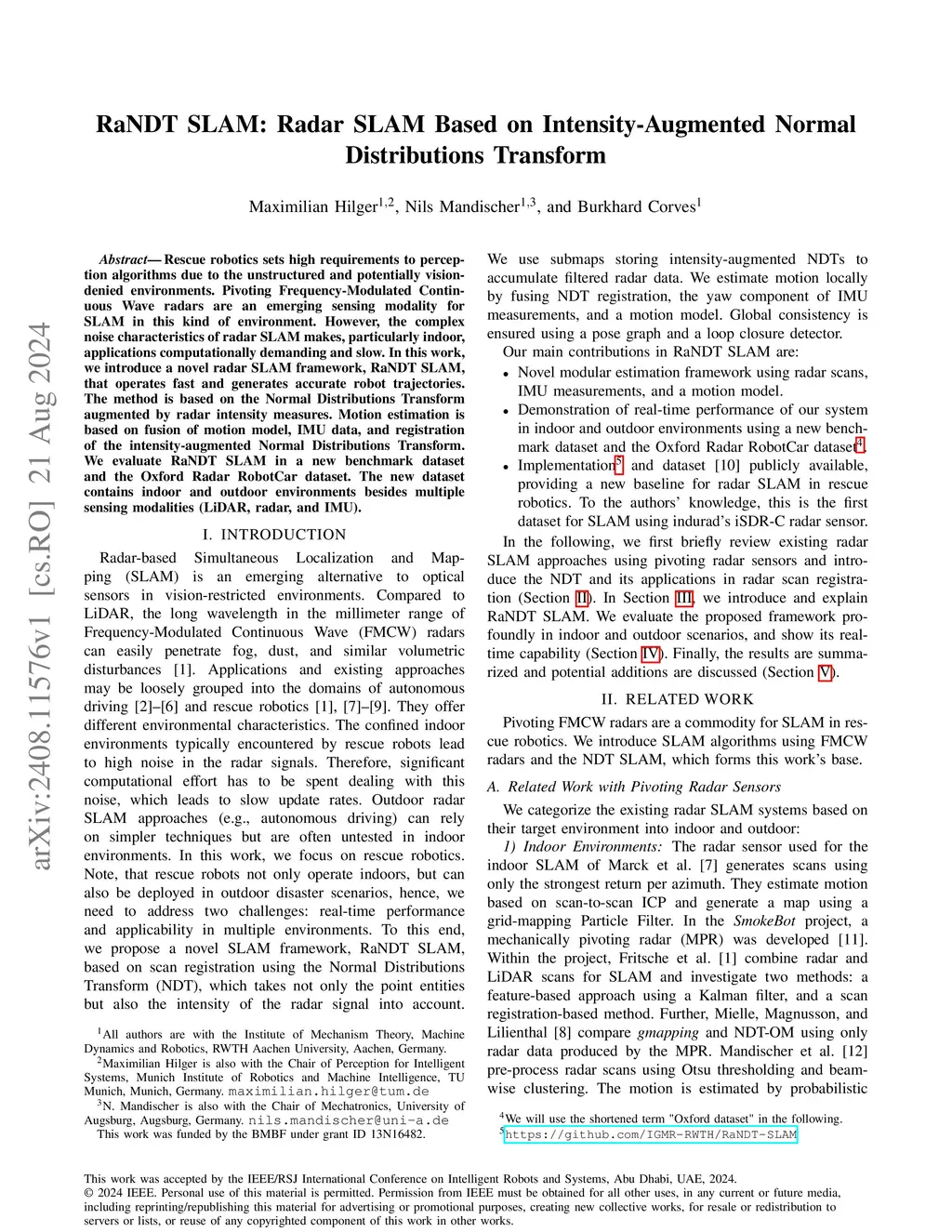 Rescue robotics sets high requirements to perception algorithms due to the unstructured and potentially vision-denied environments. Pivoting Frequency-Modulated Continuous Wave radars are an emerging sensing modality for SLAM in this kind of environment. However, the complex noise characteristics of radar SLAM makes, particularly indoor, applications computationally demanding and slow. In this work, we introduce a novel radar SLAM framework, RaNDT SLAM, that operates fast and generates accurate robot trajectories. The method is based on the Normal Distributions Transform augmented by radar intensity measures. Motion estimation is based on fusion of motion model, IMU data, and registration of the intensity-augmented Normal Distributions Transform. We evaluate RaNDT SLAM in a new benchmark dataset and the Oxford Radar RobotCar dataset. The new dataset contains indoor and outdoor environments besides multiple sensing modalities (LiDAR, radar, and IMU).