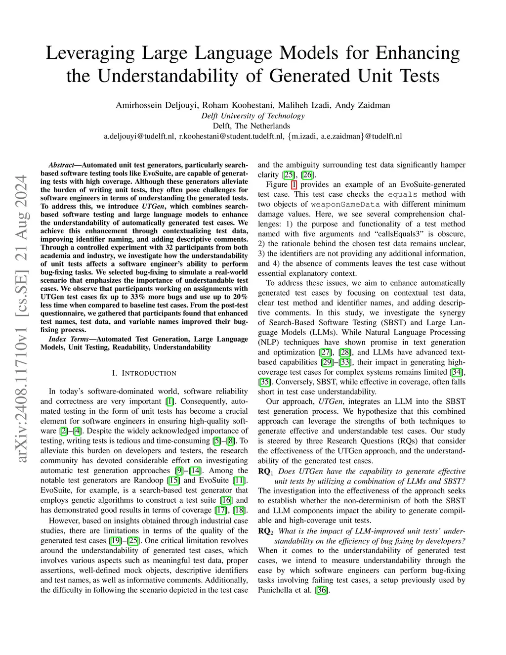 Automated unit test generators, particularly search-based software testing tools like EvoSuite, are capable of generating tests with high coverage. Although these generators alleviate the burden of writing unit tests, they often pose challenges for software engineers in terms of understanding the generated tests. To address this, we introduce UTGen, which combines search-based software testing and large language models to enhance the understandability of automatically generated test cases. We achieve this enhancement through contextualizing test data, improving identifier naming, and adding descriptive comments. Through a controlled experiment with 32 participants from both academia and industry, we investigate how the understandability of unit tests affects a software engineer's ability to perform bug-fixing tasks. We selected bug-fixing to simulate a real-world scenario that emphasizes the importance of understandable test cases. We observe that participants working on assignments with UTGen test cases fix up to 33% more bugs and use up to 20% less time when compared to baseline test cases. From the post-test questionnaire, we gathered that participants found that enhanced test names, test data, and variable names improved their bug-fixing process.