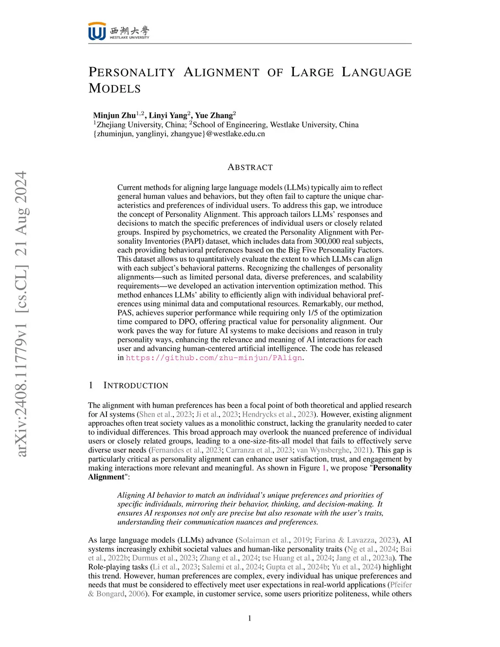 Aligning large language models (LLMs) typically aim to reflect general human values and behaviors, but they often fail to capture the unique characteristics and preferences of individual users. To address this gap, we introduce the concept of Personality Alignment. This approach tailors LLMs' responses and decisions to match the specific preferences of individual users or closely related groups. Inspired by psychometrics, we created the Personality Alignment with Personality Inventories (PAPI) dataset, which includes data from over 320,000 real subjects across multiple personality assessments, including both the Big Five Personality Factors and Dark Triad traits. This comprehensive dataset enables quantitative evaluation of LLMs' alignment capabilities across both positive and potentially problematic personality dimensions. Recognizing the challenges of personality alignments, such as limited personal data, diverse preferences, and scalability requirements, we developed an activation intervention optimization method. This method enhances LLMs' ability to efficiently align with individual behavioral preferences using minimal data and computational resources. Remarkably, our method, PAS, achieves superior performance while requiring only 1/5 of the optimization time compared to DPO, offering practical value for personality alignment. Our work paves the way for future AI systems to make decisions and reason in truly personality ways, enhancing the relevance and meaning of AI interactions for each user and advancing human-centered artificial intelligence. The dataset and code are released atthis https URL.