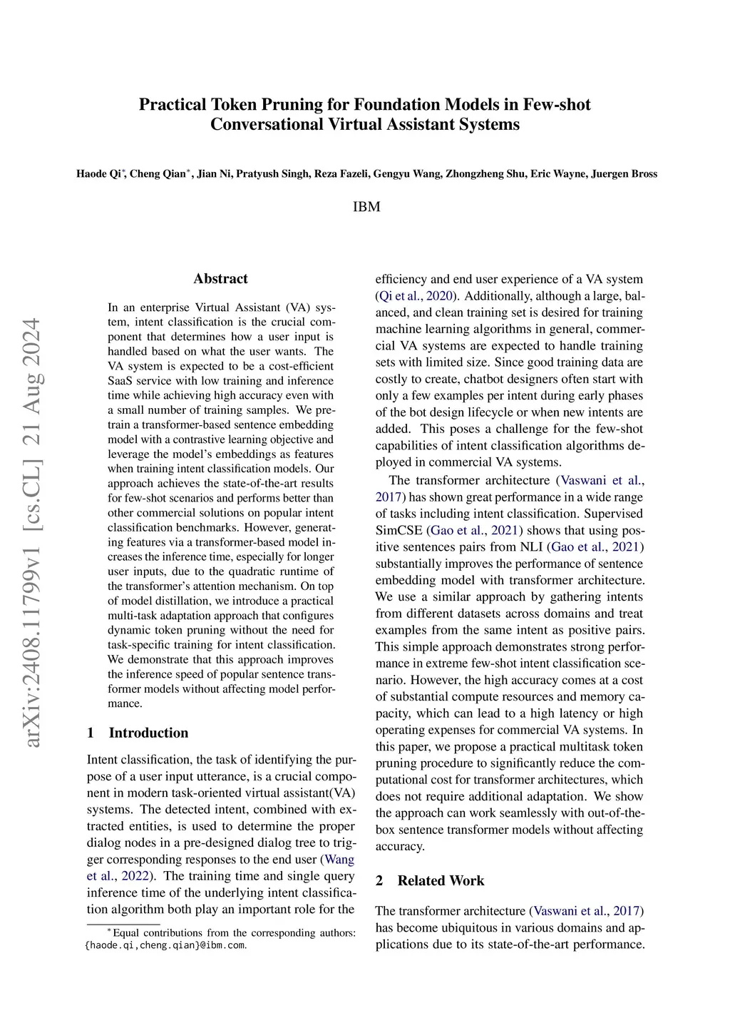 In an enterprise Virtual Assistant (VA) system, intent classification is the crucial component that determines how a user input is handled based on what the user wants. The VA system is expected to be a cost-efficient SaaS service with low training and inference time while achieving high accuracy even with a small number of training samples. We pretrain a transformer-based sentence embedding model with a contrastive learning objective and leverage the embedding of the model as features when training intent classification models. Our approach achieves the state-of-the-art results for few-shot scenarios and performs better than other commercial solutions on popular intent classification benchmarks. However, generating features via a transformer-based model increases the inference time, especially for longer user inputs, due to the quadratic runtime of the transformer's attention mechanism. On top of model distillation, we introduce a practical multi-task adaptation approach that configures dynamic token pruning without the need for task-specific training for intent classification. We demonstrate that this approach improves the inference speed of popular sentence transformer models without affecting model performance.